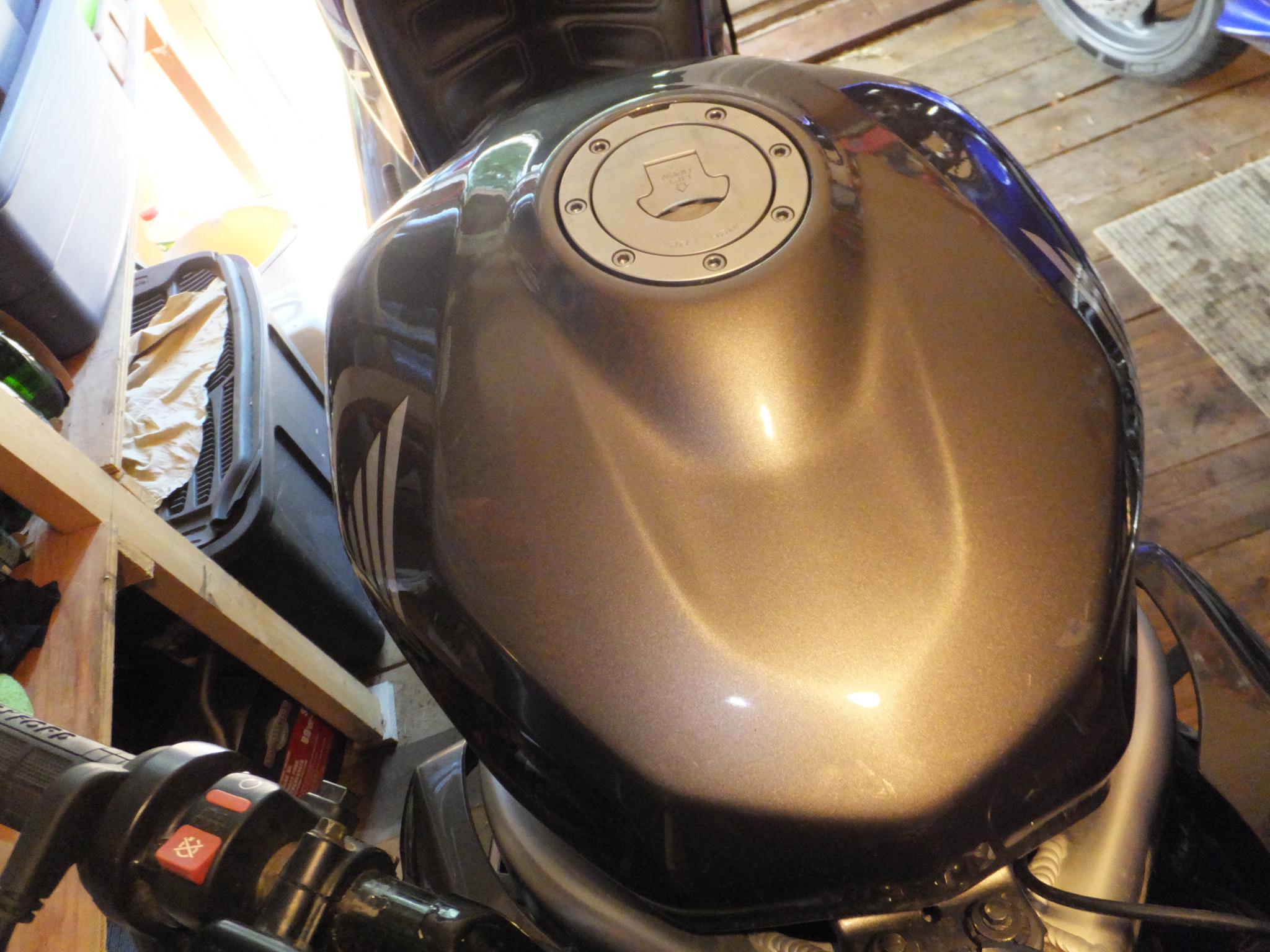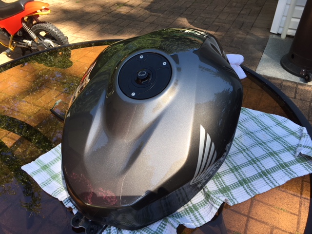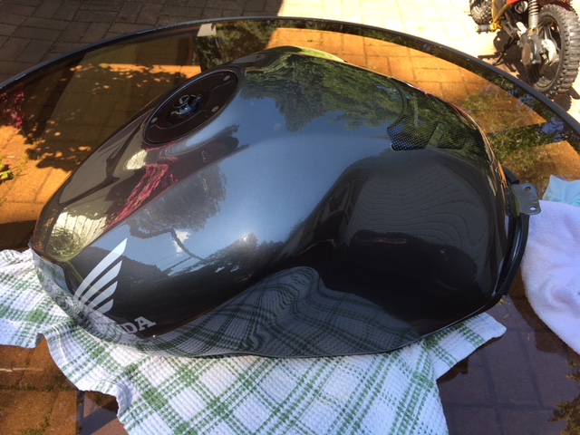 Here are some photos of the tank off the bike. I was getting over 300km (188 miles) on a tank of regular with everyhing stock except for #48 slow jets, which are richer than the stock 45s.