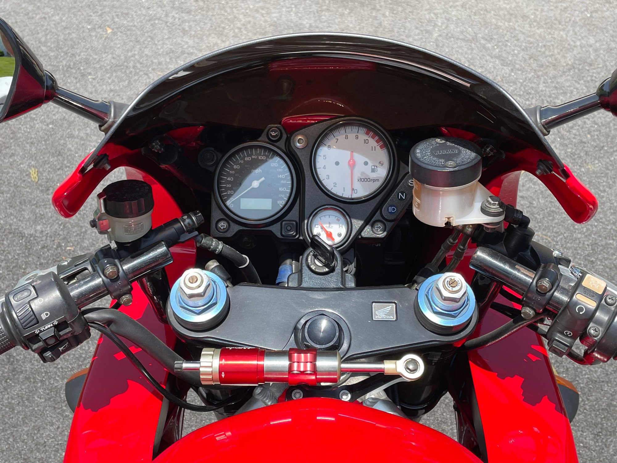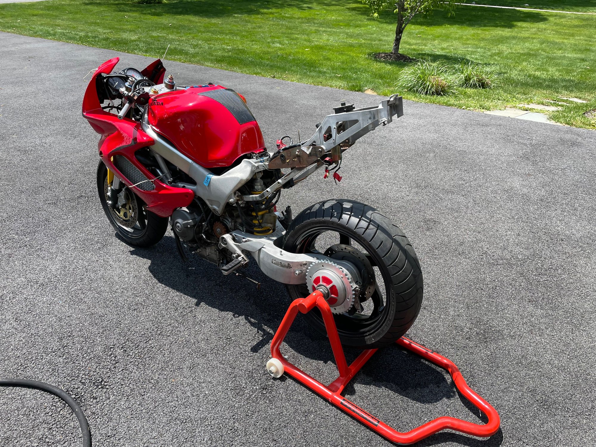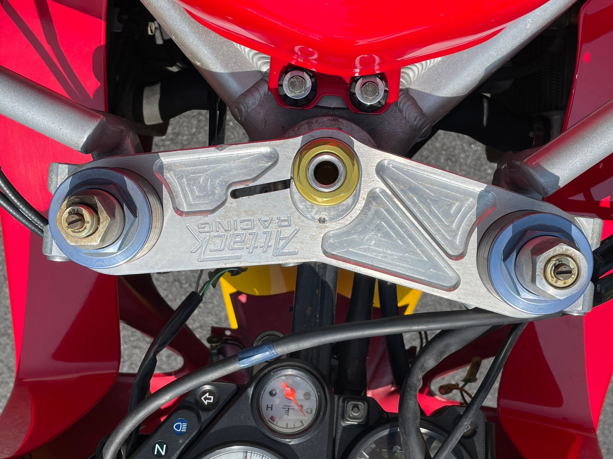 Attack Adjustable Triple Clamps from a RC51 – these are adjustable. I bought them as they push the forks back out 3mm – allowing the forks to be in “stock” VTR location. These triples alone (if you can find them) are worth $1600 new.