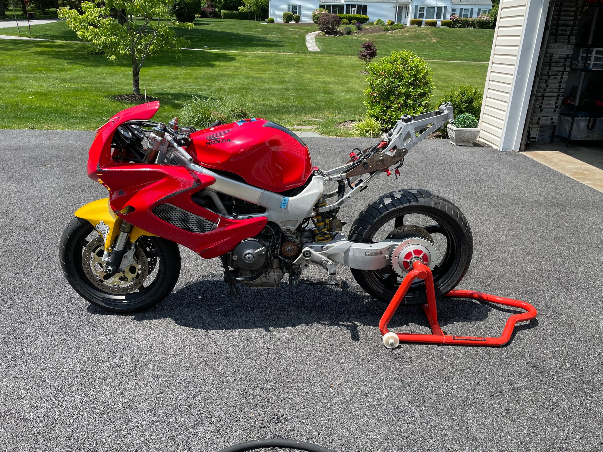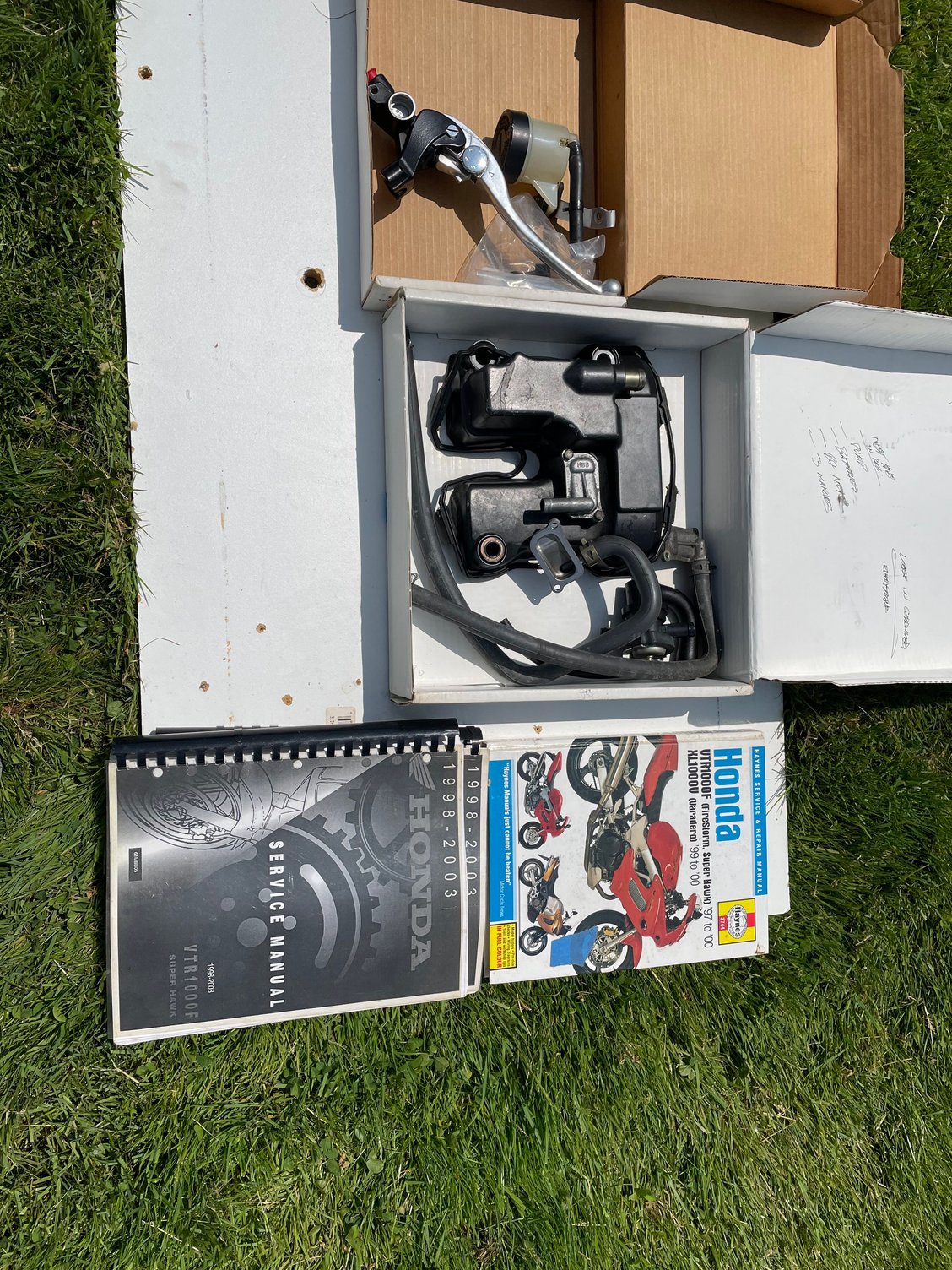 There is probably enough parts build 2 bike (minus frames/engines). Parts need some cleaning after sitting boxed in my shed – but included is everything from wheels, suspension, brakes, gas tank, wiring harnesses, speedo healer, rims, carbs, new chains, new bolts, etc, etc, etc.…. There are a set of the race tech gold valves in the VTR forks