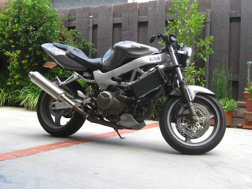 The bike is a titanium grey 2005 'hawk, 22,000 miles. It has a salvage title due to a lowside where the fairings were rashed (previous owner). I put on a "naked" style headlight instead of the fairings; a psychological trick to keep my speed down.