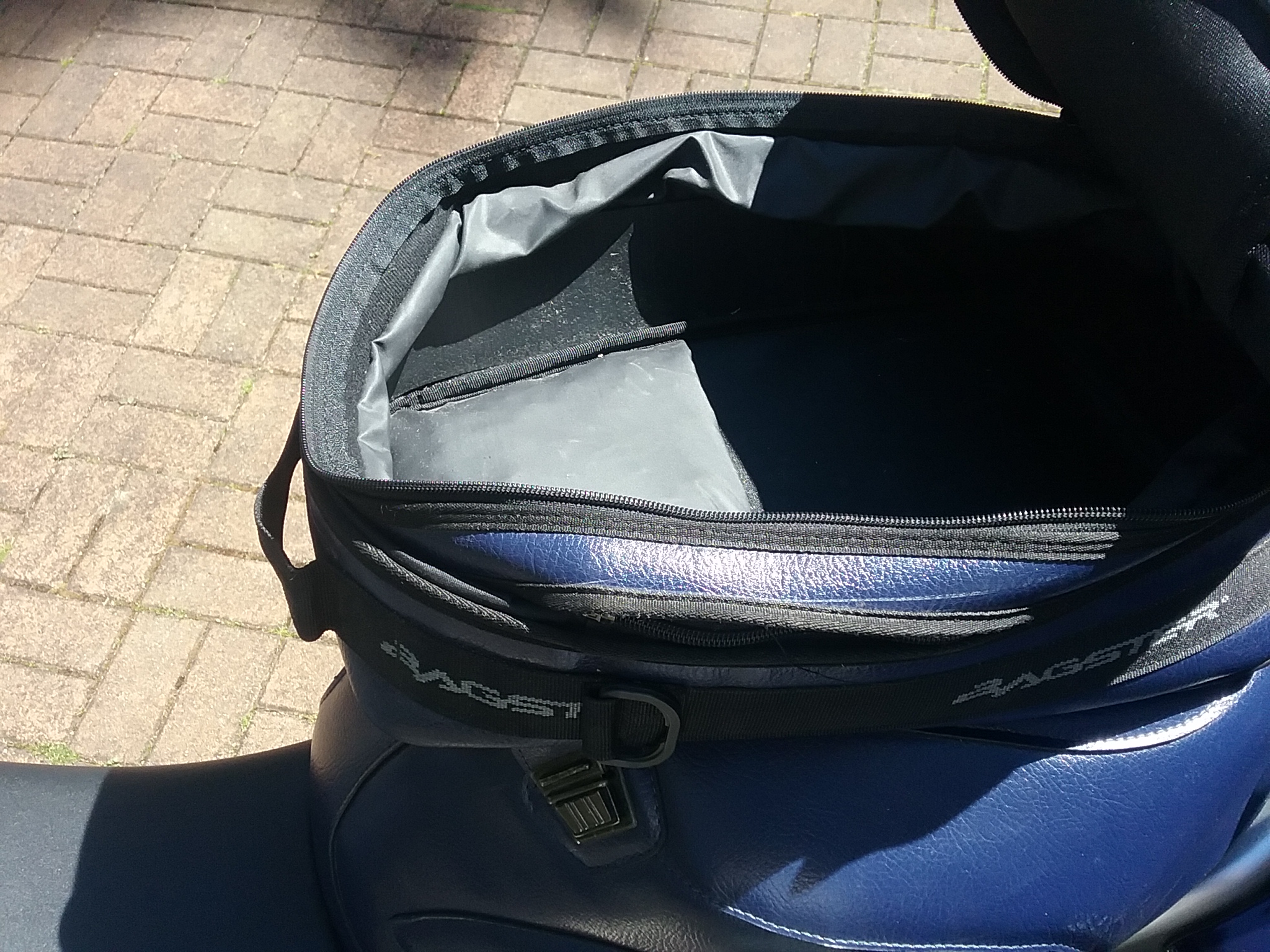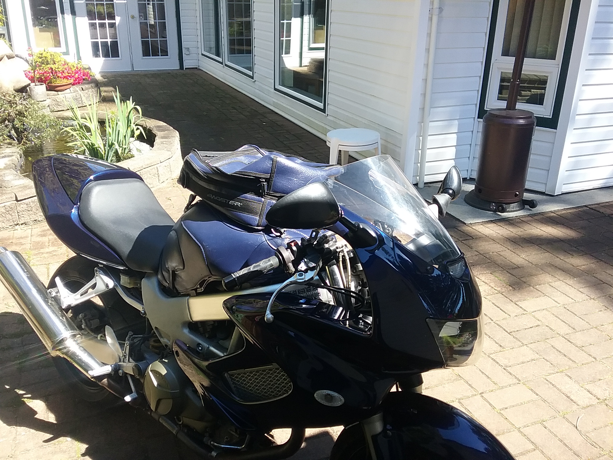 Huge tank bag, flips forward for fueling. Probably all the luggage room you'd need for a weekend! Blue matches my '02 VTR. $75 posted anywhere in lower 48 or Canada.