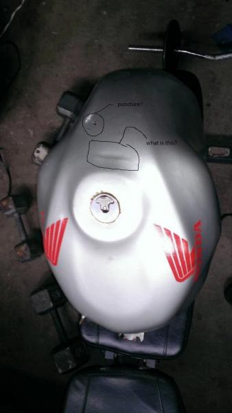 What looked like puncture in the previuos post was just the silver paint peeld off the tank when my friend removed a tank protector that was on it.