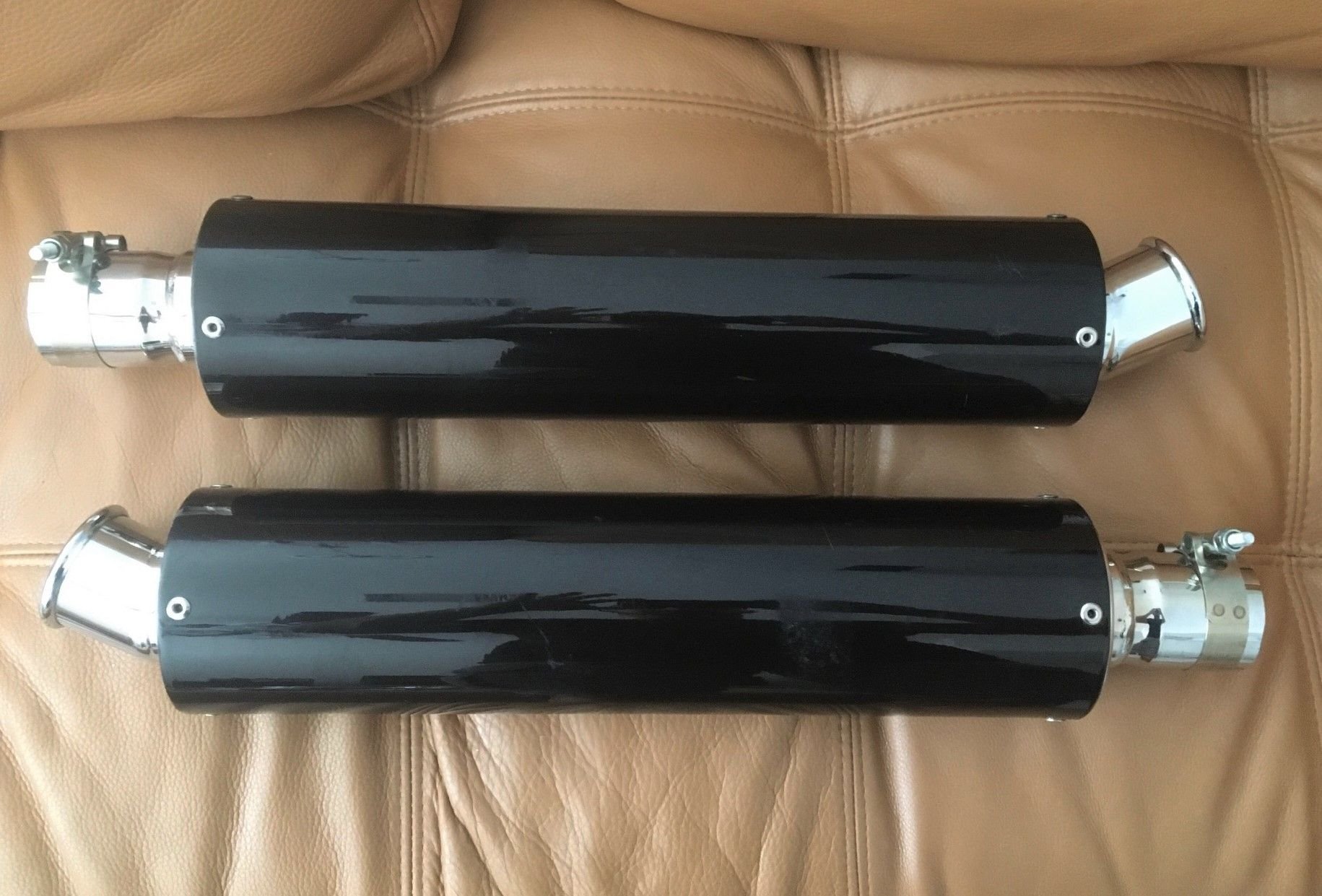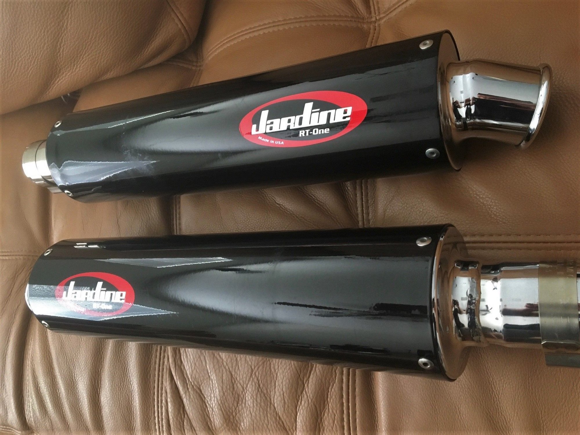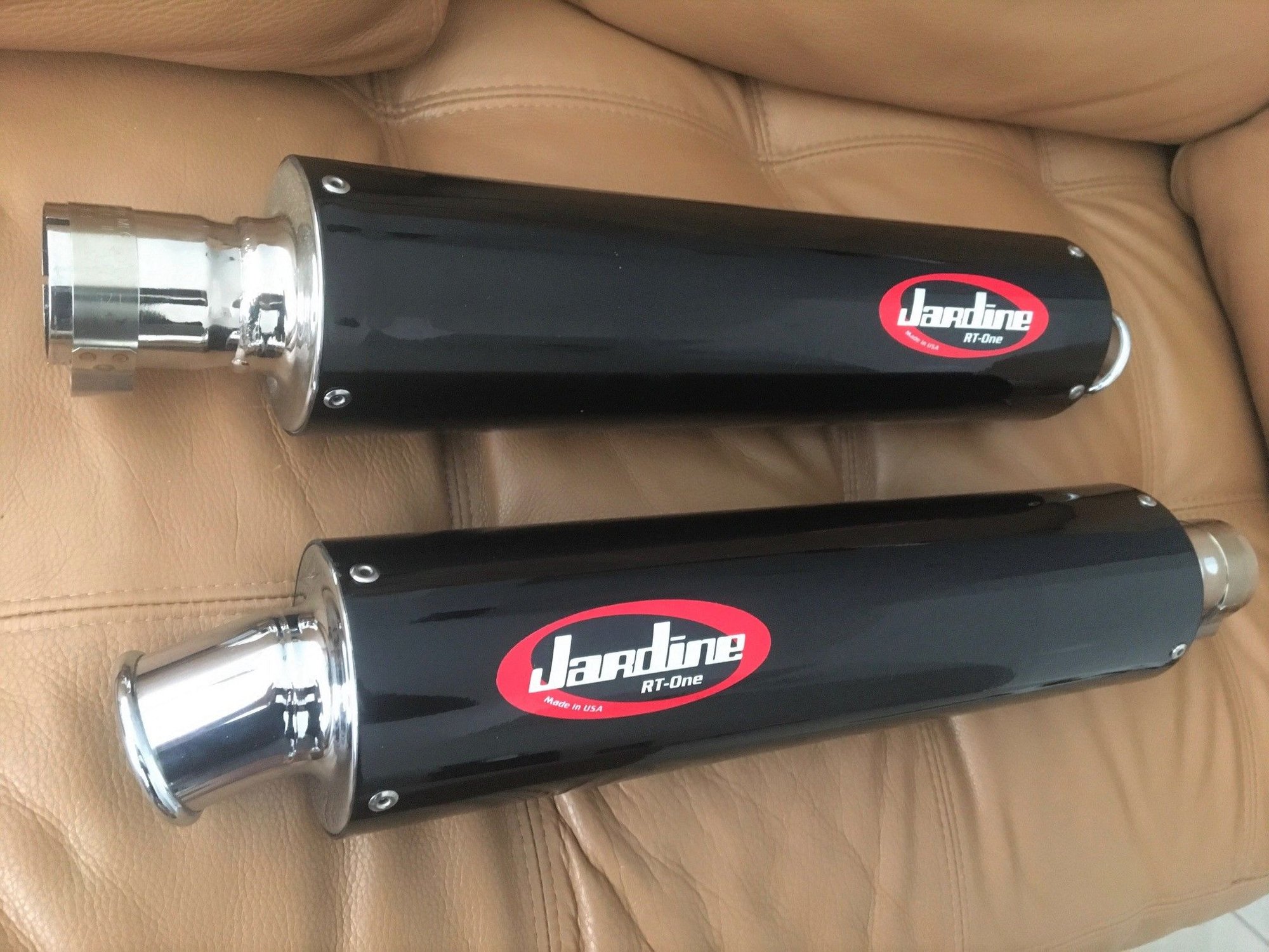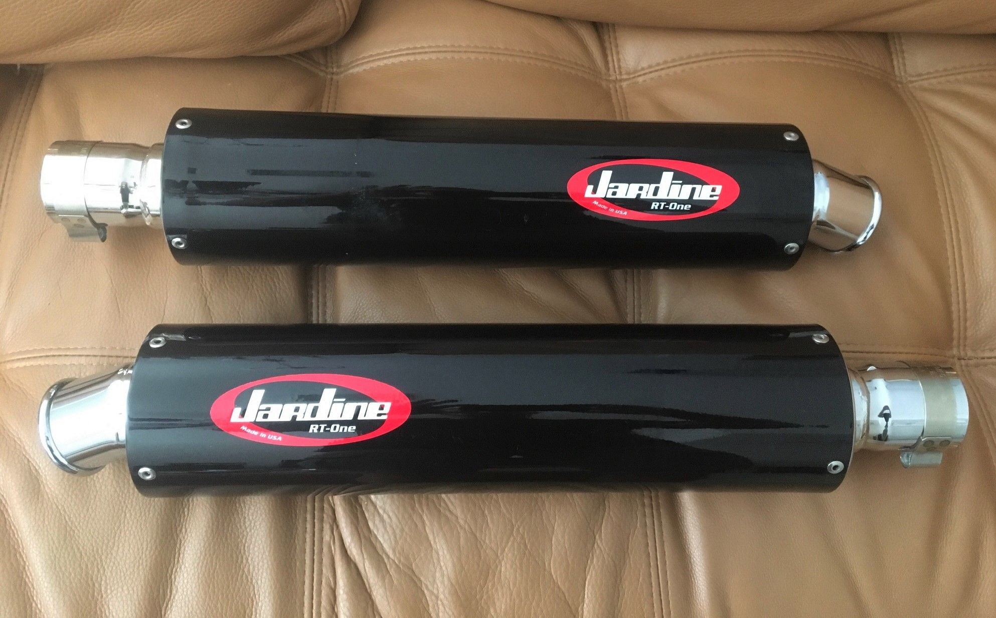 Beautiful nearly new pair of Jardine RT-One round black powdercoat high mount slip on exhaust mufflers. These haven't been available new from Jardine for quite a few years. They've been detailed and are about as close to a brand new pair of these as I believe you're going to find. Chrome midpipes are in perfect condition (they're not even discolored from heat yet). Polished aluminum hanger brackets. Brushed aluminum straps with rubber gaskets in perfect condition. These were previously mounted for a very short time so if you look close enough there are some very minor scuffs/scratches here and there on the mufflers. Decals look new. All chrome looks perfect. Clamps look new. Includes a perfect set of original bolts and spacers if you'd like to run your passenger pegs.