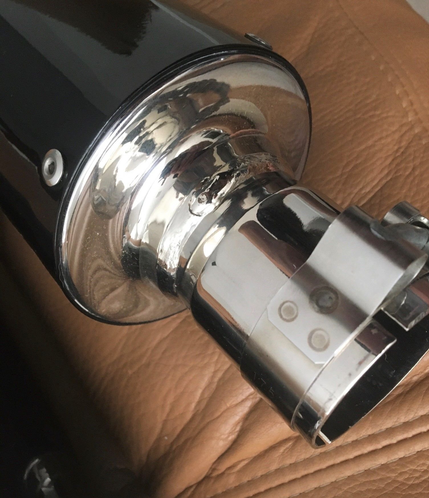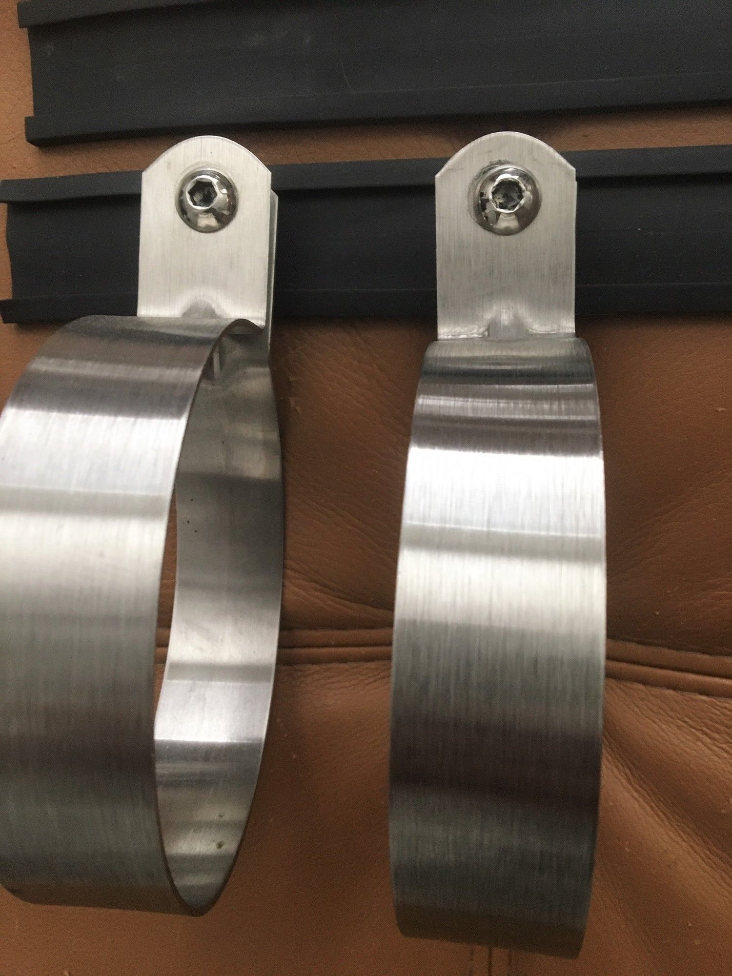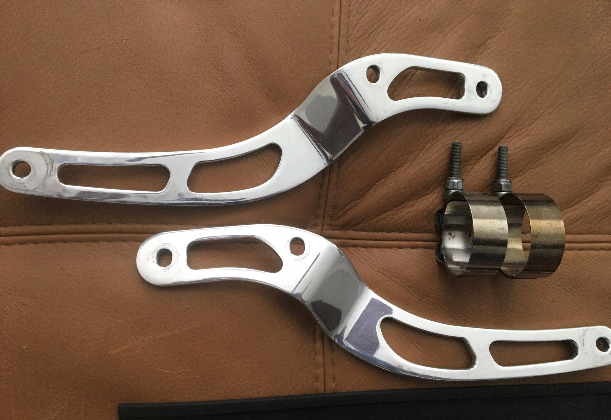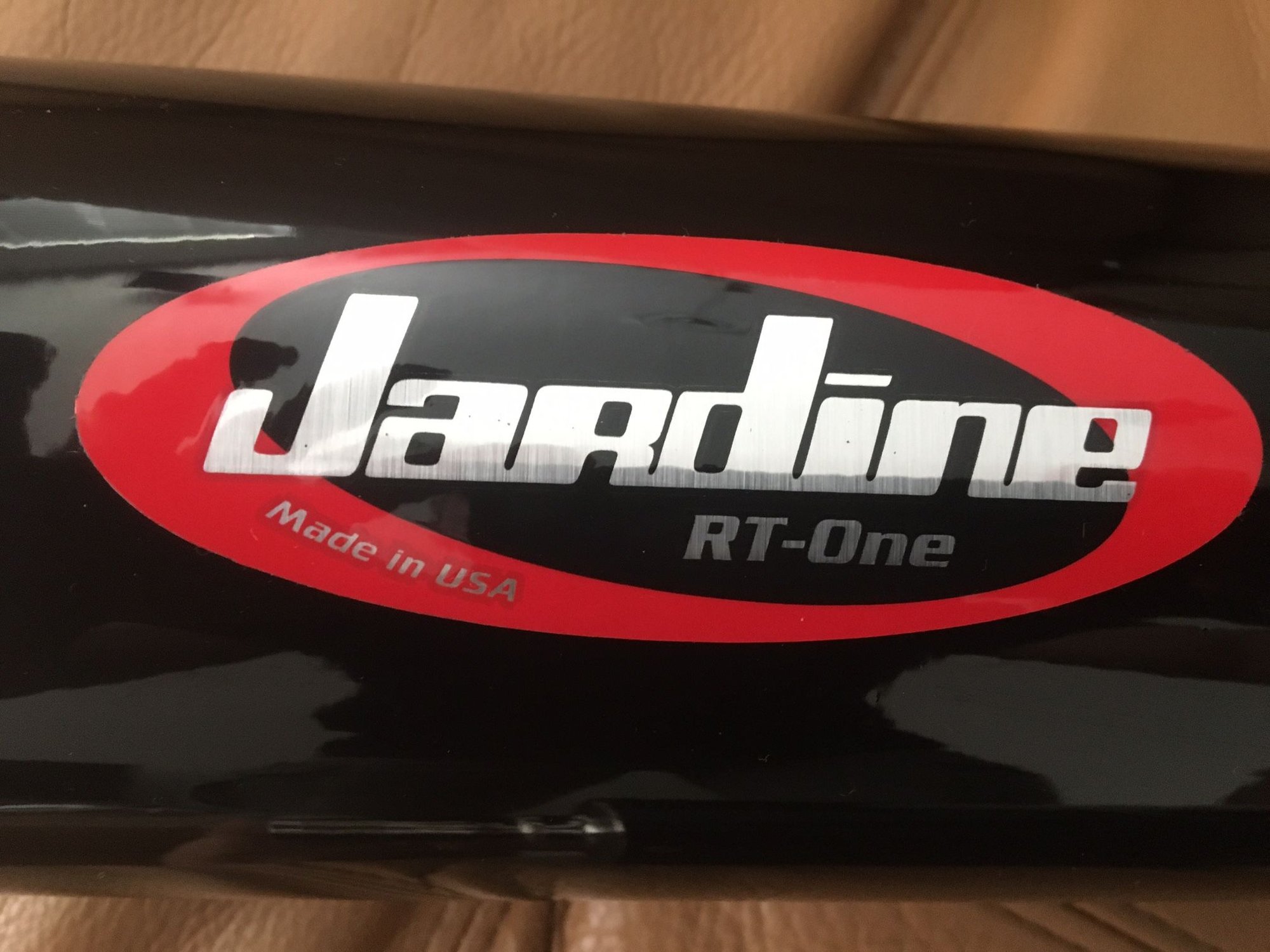 Beautiful nearly new pair of Jardine RT-One round black powdercoat high mount slip on exhaust mufflers. These haven't been available new from Jardine for quite a few years. They've been detailed and are about as close to a brand new pair of these as I believe you're going to find. Chrome midpipes are in perfect condition (they're not even discolored from heat yet). Polished aluminum hanger brackets. Brushed aluminum straps with rubber gaskets in perfect condition. These were previously mounted for a very short time so if you look close enough there are some very minor scuffs/scratches here and there on the mufflers. Decals look new. All chrome looks perfect. Clamps look new. Includes a perfect set of original bolts and spacers if you'd like to run your passenger pegs.
