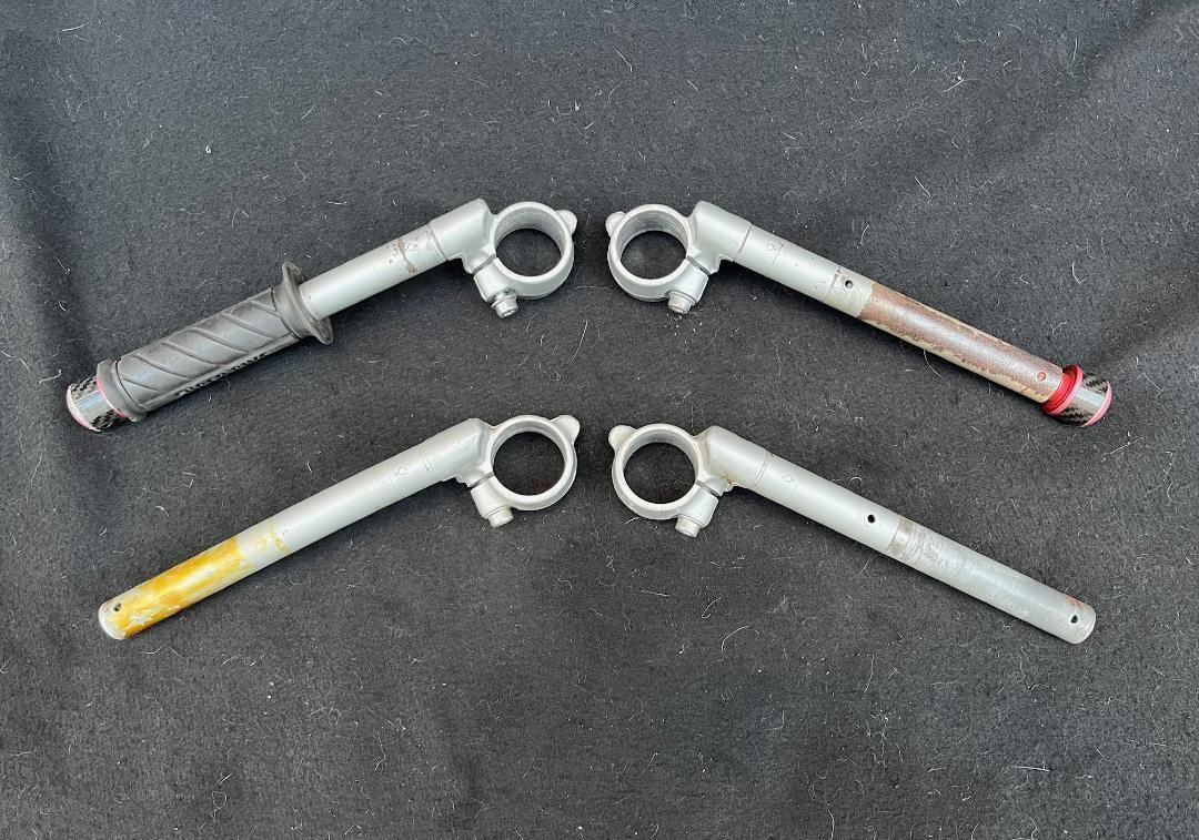 OEM clips ons (2 pairs). Both are straight. One set has an aftermarket grip and bar ends as you can see. Below I also have a set of switches and a nice throttle tube and cables. I also have some nice extra OEM grips if you need, just let me know and I'll work it out with you. Can't remember if they have the original weights inside. I forgot to check but will pull them down and check and update the ad shortly. $40 per pair.