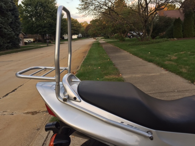 I do not ride this bike for trips any more, so this bag is up for sale. The condition of the bag system is like new, not faded but it was used a few times. You will receive the complete system; Large black top bag, silver tail L-bracket, tall rail rack for the bag, smaller sport rack and assy bolts.