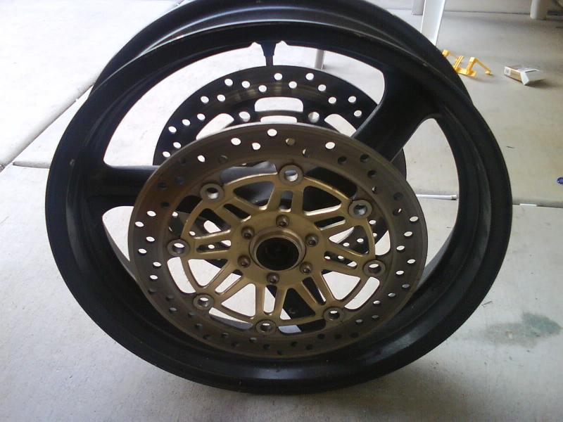 the rear rim is in perfect shape but I forgot to take a pic of it I am selling the set for 125 plus shipping they come with bearings axle rotors pretty much everything but it does not come with the rear sproket thx guys. you can see the back rim is mounted on my bike right now. If you want the rubber that is on the back wheel add 50 bucks it is a dunlap qualifier with mabeee 600 miles on them