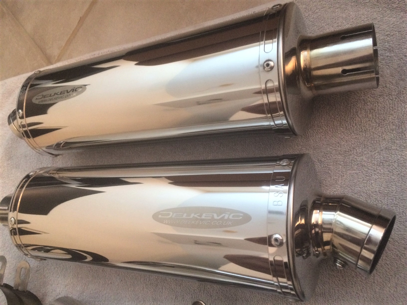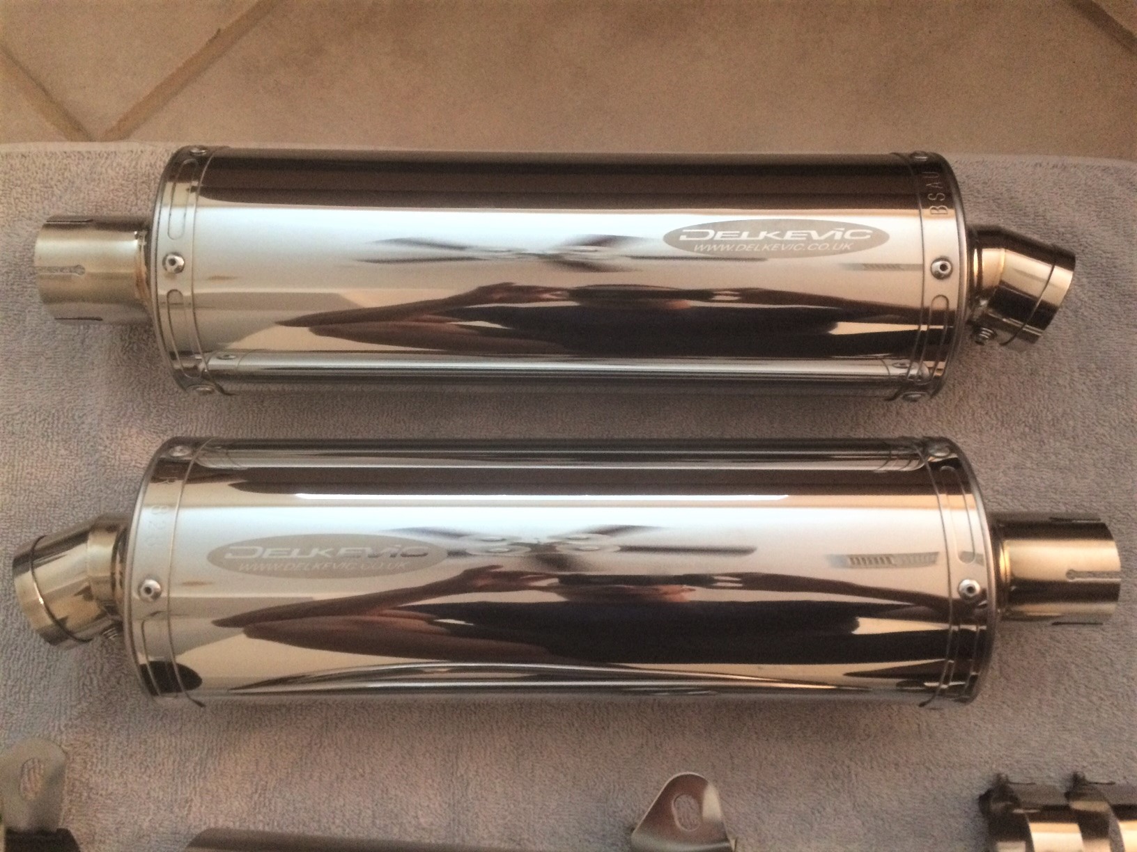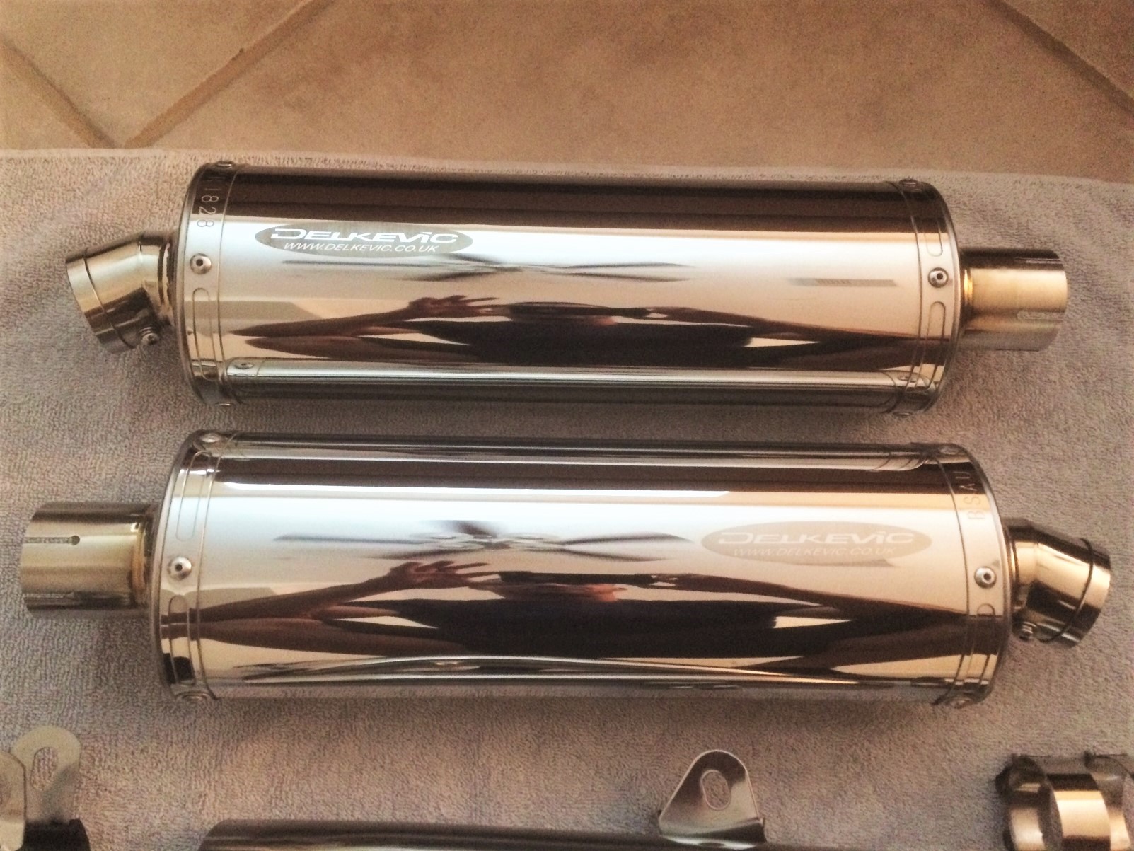 SOLD: Delkevic polished stainless standard/low mount slip on exhaust mufflers