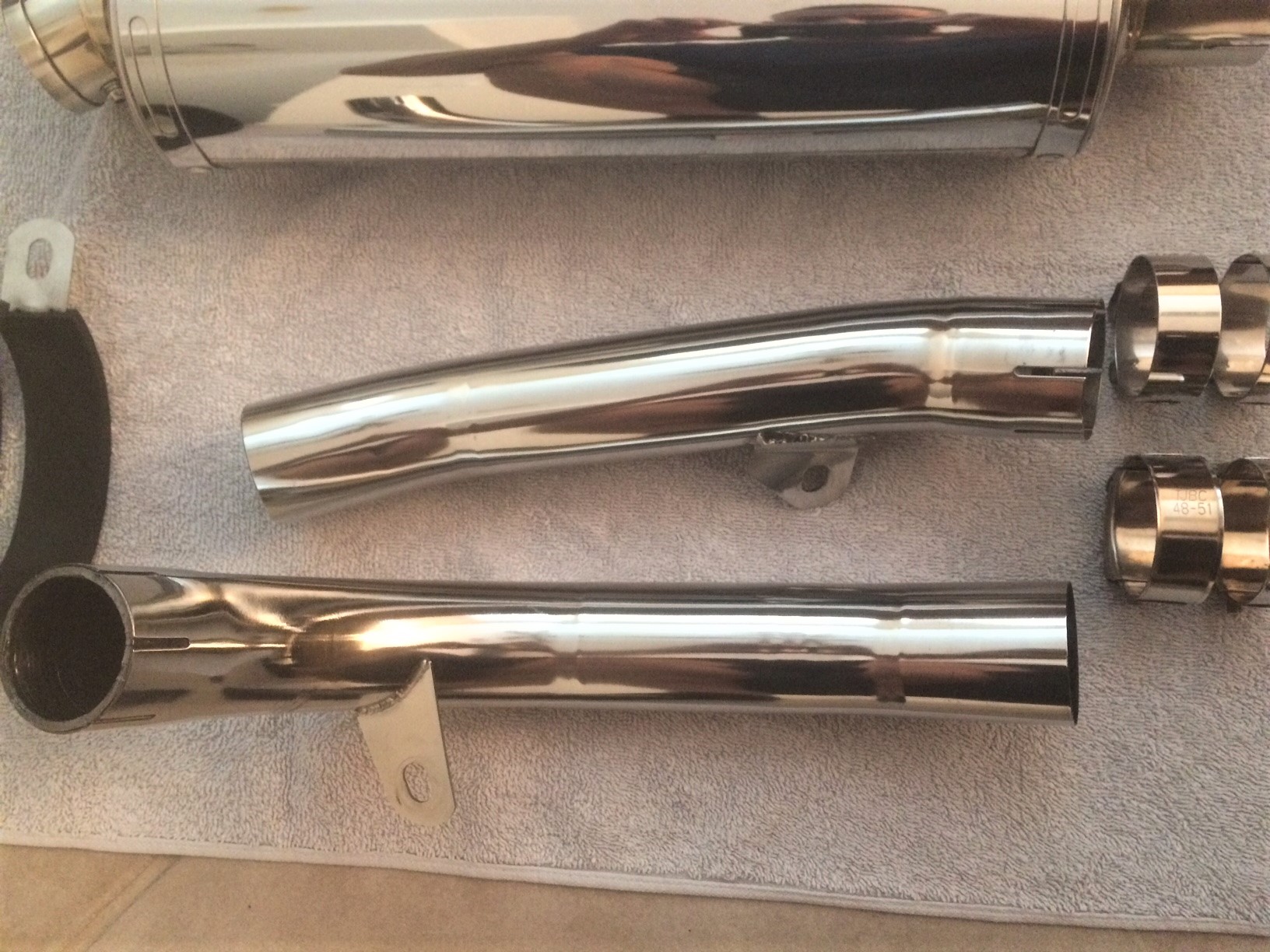 SOLD SOLD SOLD Got these on a trade for another exhaust I was selling. Spent some time hand polishing with some Mothers and Meguiars wax and these pretty much look brand new. Polished stainless steel. 14" mufflers. The workmanship and construction on these is absolutely beautiful. Includes removable DB killers along with everything else shown/needed for mounting. Midpipes have the gaskets already inside in perfect condition. Tiny spot of chain rub on top of left midpipe like pretty much any used exhaust. I could sand and polish it out but there's no need as you can't see it. Tiny split in the back of one of the hanger gaskets. Again, won't be seen mounted. I'm being REALLY picky here... Otherwise again these basically look brand new.