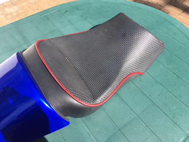 I bought a Corbin, This is in good but not excellent condition. The back bit was red; I sprayed it black with vinyl paint. Looks fine under a cowl! The seat is comfy, nor rips or tears except for a bit where it's worn at the front (out of sight). I'll post it from Blaine WA at buyer's expense.