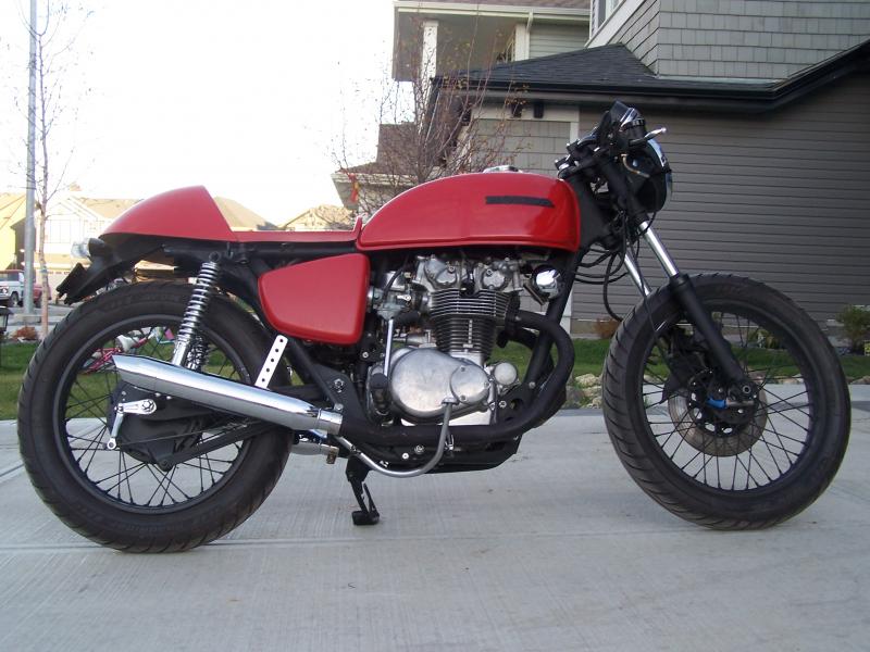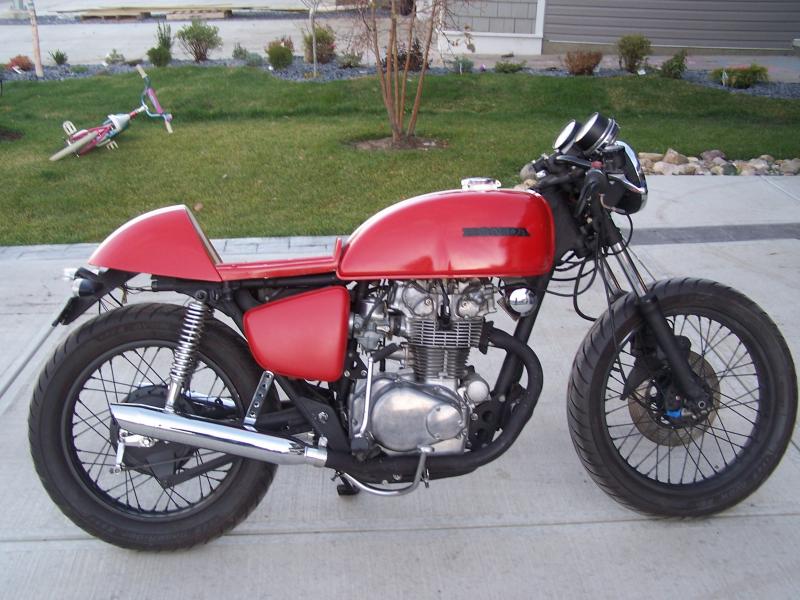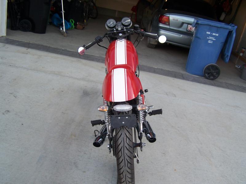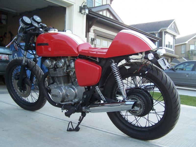 So about a month ago, actually the day we won gold in men's hockey, I picked up a project. I have never tried anything like this before so please be kind (even you Tweety . It's a 1975 Honda CB500T that was very neglected. Mostly what I have done was strip it down and do a lot of cleaning and painting. The few things I have changed are the clubman bars, I put some Ducati 1098 rearsets on and a modified ducati fender for the back. Once the motor is back together and in I will fit the new exhaust which will have about a 20 degree angle to it hopefully. Let me know what ya'll think?