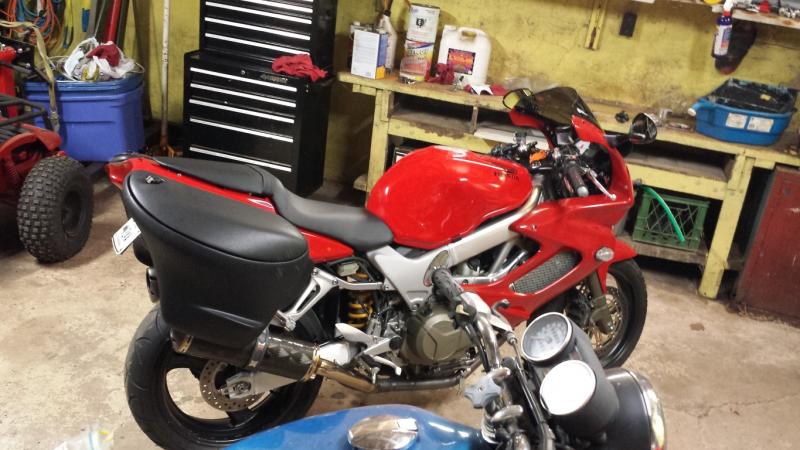 new fairing stay, new headlight, new left fairing, new exhaust, remove and plastic weld the rest of the fairings (plastic welding is super easy, and works great) a pair of beetle bags... and some other odds and ends and just about done.