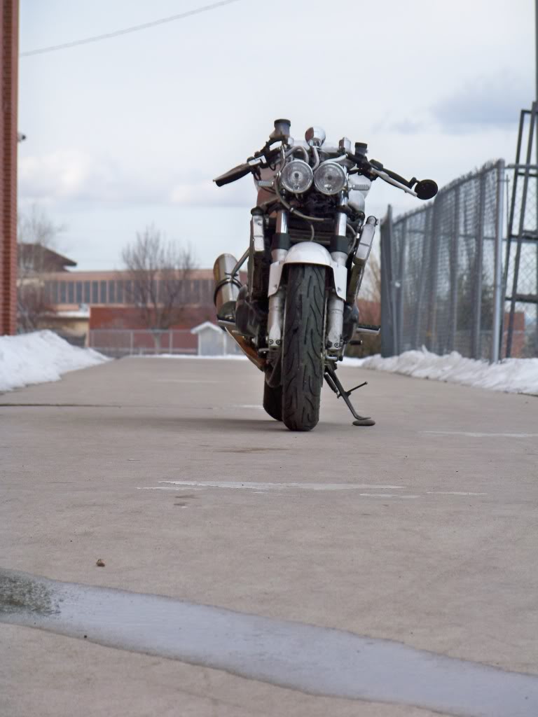 I am pretty much done visually with the project, at least for now. I am going to make an alloy tank for it this fall, but the painted stocker will suffice. I have a few more weight items to replace and it will be ready to ride. I wheeled it through the ice and snow to get it off site for some better pics than my previous ones. This end result has fulfilled most o the vision in my head; namely to remove the obese rear tail section of the stock bike, and create something of a "throwback" to the cafe racer movement. This entailed greatly reducing the amount of plastic and "transformer" components of the bike, and simplify it a great deal. The added advantage is weight savings. I will keep this posted to that end. Not a favorite of all, to be sure, but an end product that is more unique than the VTR already is!