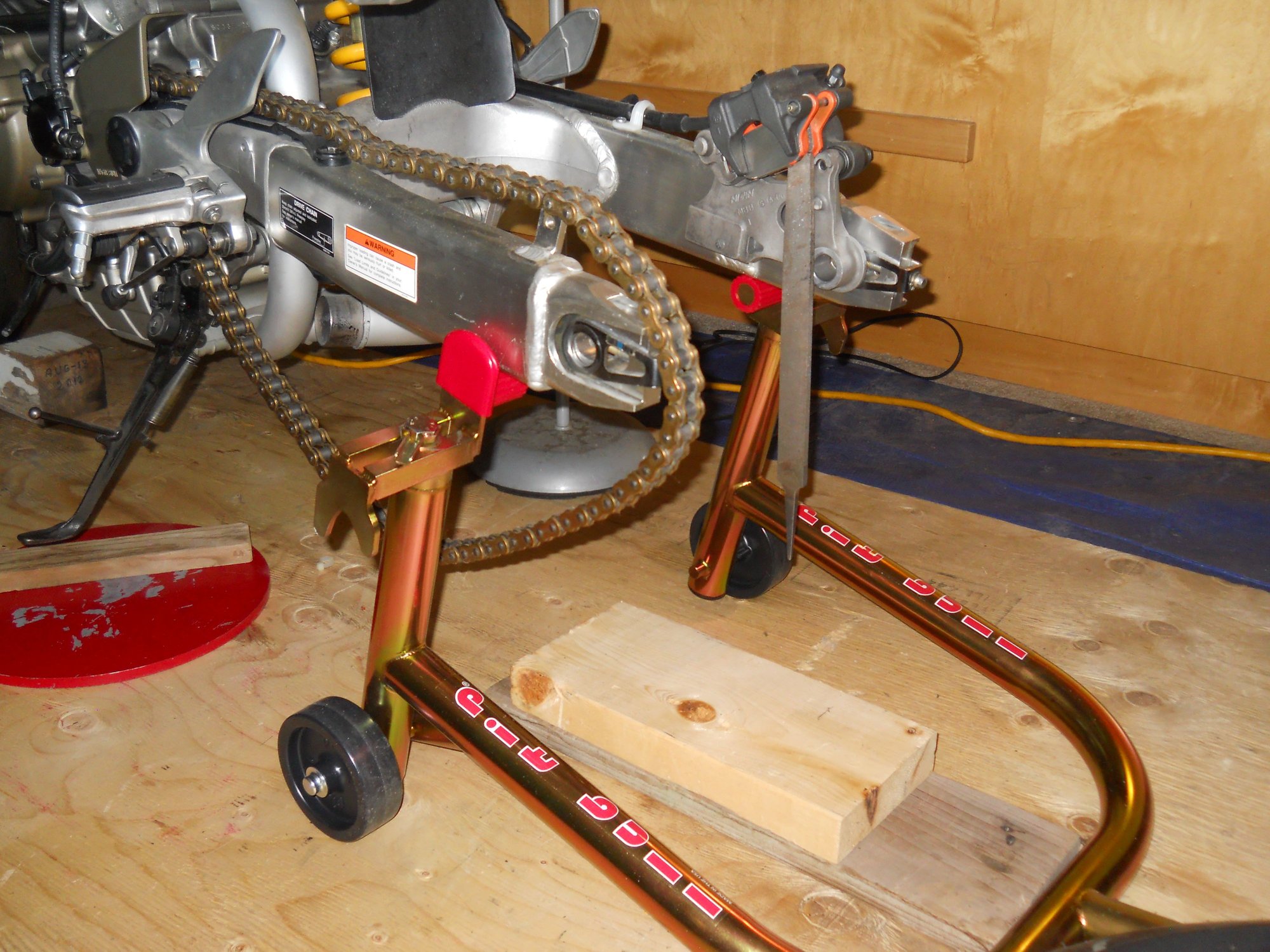 Take the cowls off and take the tank off so you won't damage anything just in case. You should see the job clear in front of you now. Support the rear of the bike on both sides of the swingarm at the axle using a bike stand or even 7 foot long pieces of 2x4 pieces of wood stacked; thats kinda hillbilly but it will work. You can use the top yoke to lift the front of the bike just high enough to have the front wheel an inch or two off the ground. Then you are going to set it back down on some blocks at the front of the oil pan. The bike balances about halfway along the oil pan; support the front of the oil pan and bike will rock back. Support the back of the oil pan and bike will rock forward. Not sure if I'm helping you much.