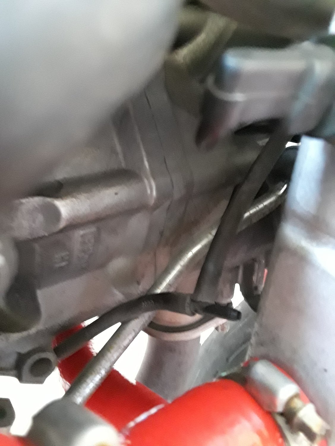the other hose with the T fitting looks like a vacuum line and needs to be sealed or reattached so you do not have a vacuum leak.