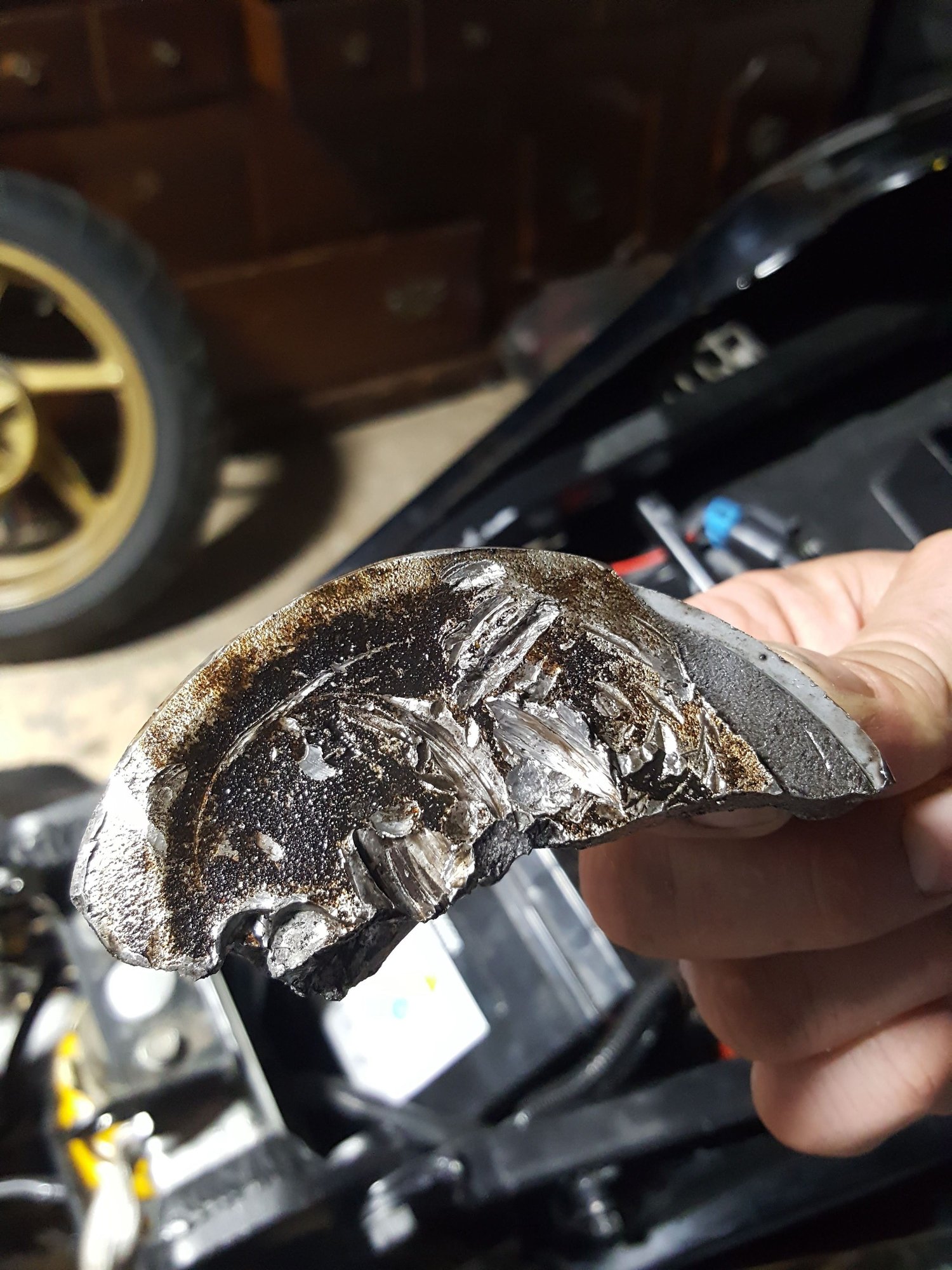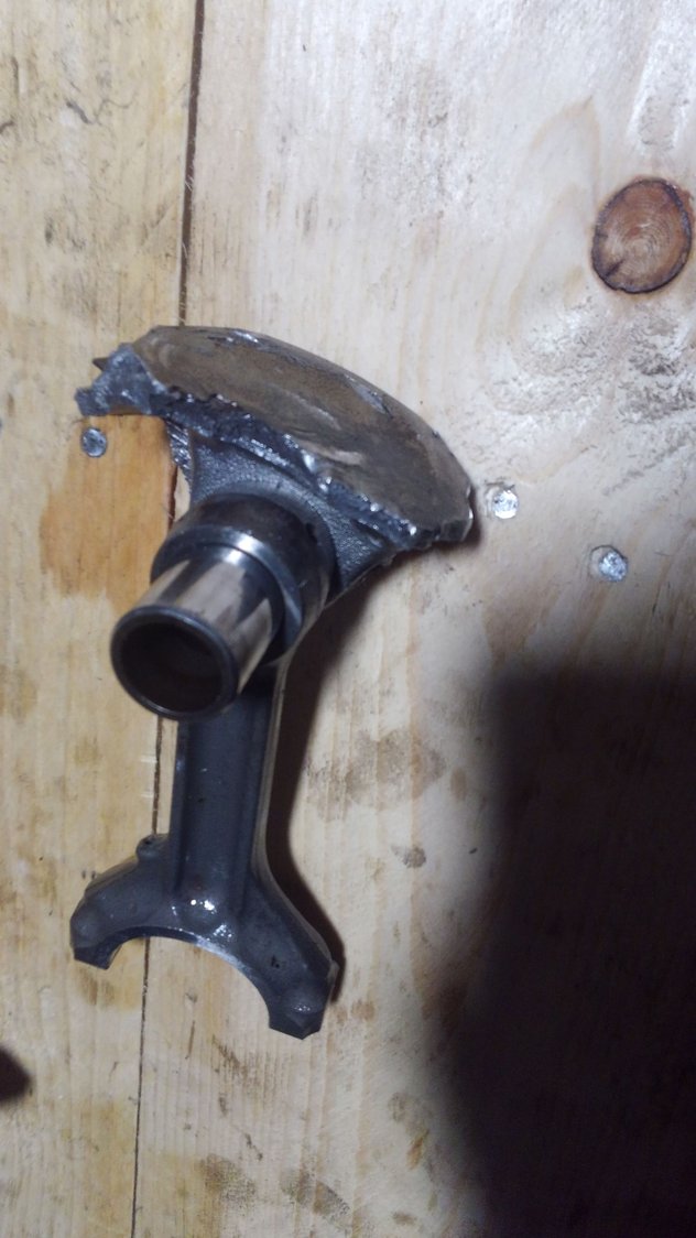 Rear cylinder. After closer inspection I do not think the locks are to blame. I hastily assumed it to be the case because of the way the valve appeared initially. However, up on closer inspection of the piston on the main fracture line it appears as though I had a slight crack or casting imperfection all along. I say this because the crack follows a casting mark perfectly and there are dissimilar colors of metal within the crack. Typically that indicates an old crack where contaminants have penetrated; I think I may have encouraged that crack to grow with some ham-fisted persuasion. I say this not as an arm chair novice but as a fairly experienced ultrasonic inspector. I recall seeing evidence quite similar in destructive testing practices to verify non-destructive results, especially in cast materials, though usually on welded pieces.