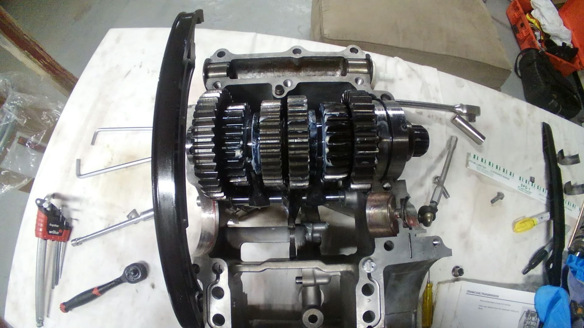 No biggy, it's apart and on the road to recovery. I have a spare set of cases which are being honed tomorrow to fit a set of used slugs while I laboriously clean the transmission. I simply cannot believe how much metal can be trapped in one cassette of gears. Pro tip: if you grenade your engine clean it thoroughly one piece at a time. I guess I'm thankful I bothered to put together a set of heads with new valves and all that. As long as the crank is good I should be all set by new year, possibly February.