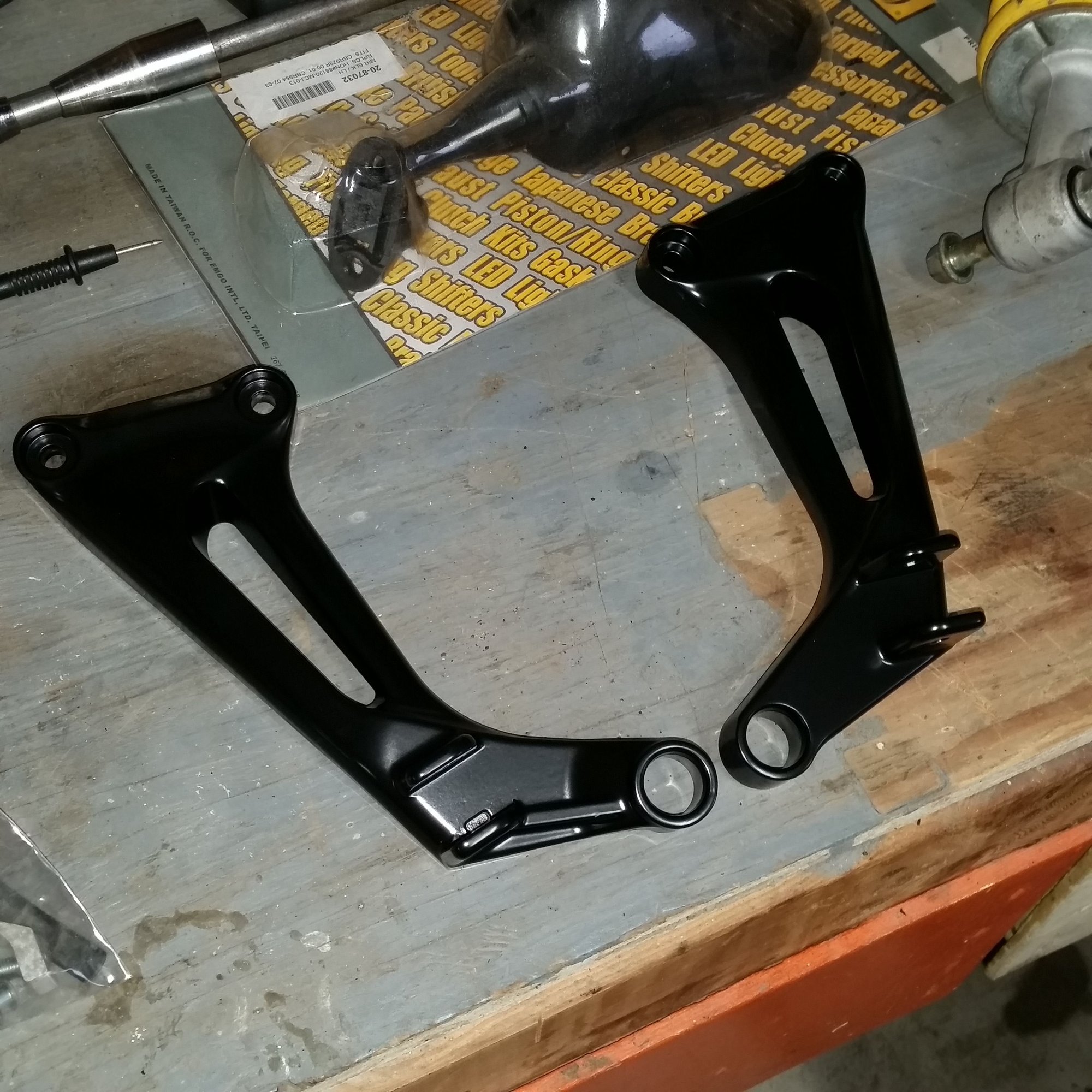 I'm in the middle of restoring a superhawk I purchased from my little brother. It was in pretty rough shape however, it rode and ran fine. The exhaust is a Two Brothers high mount system. The hangers are not stock and don't look like the ones that came with the Two Bros system originally. Anybody recognize these? I might try to repair the broken one, it'd be nice to keep the high mounts and passenger foot pegs.