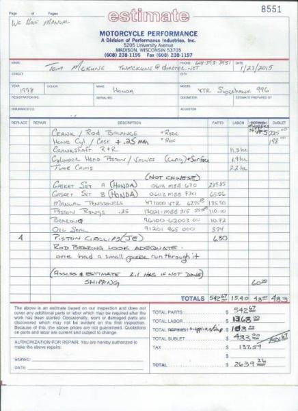 I am looking at a estimate of $2639.26. I have spent about $2500 on this motor already Plus the cost of installing it in the bike and dyno time.