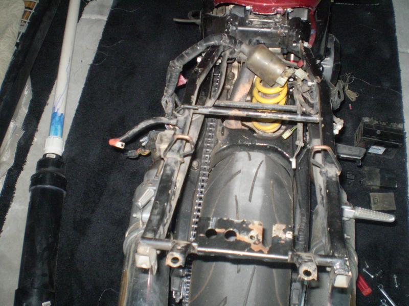 The only thing you need to do to take of the swingarm is to get either a good workstand (I have linked manuals on how to make one in other threads) or rope to a rafter or similar... Then remove the wheel, unbolt the lower link and unbolt the pivot axle... It really is that simple... Apart from various little annoyances like the rear caliper and brake line and such details...