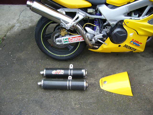 I'm getting a VTR in two days and the guy has carbon cans mounted (high mount) and he also has the original cans.