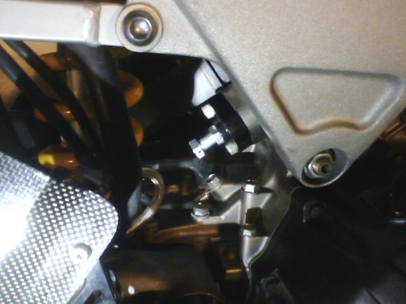One way to do it is to loosen the nut and have a friend support the bike on the side stand with the rear wheel off the ground while you slip a shim or slotted washer into the gap between the bracket and the frame.