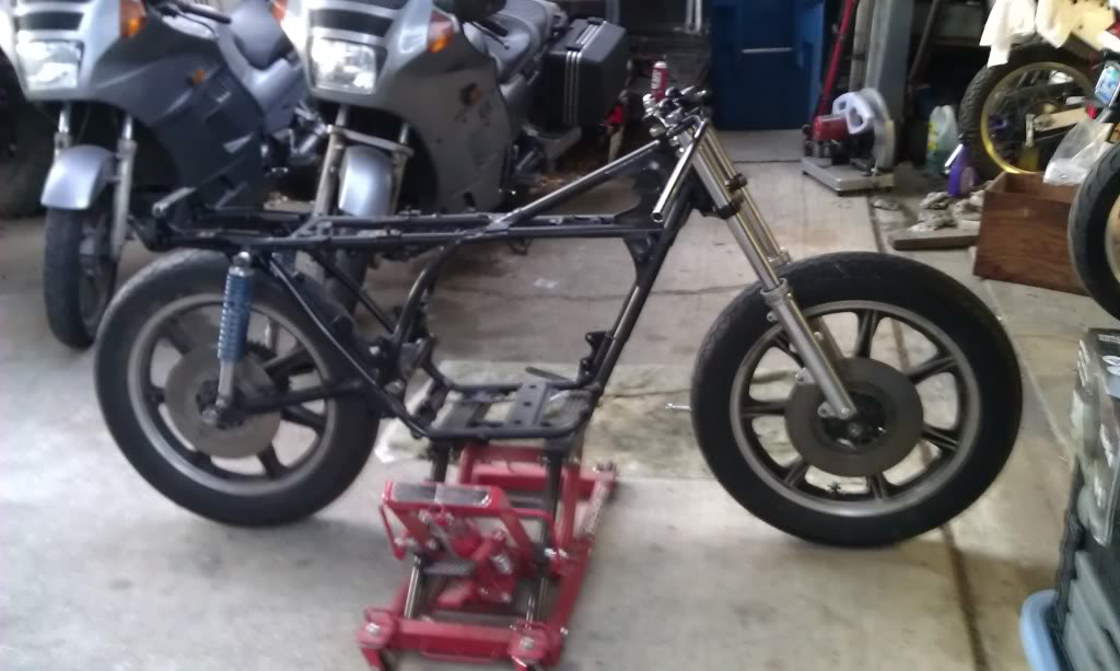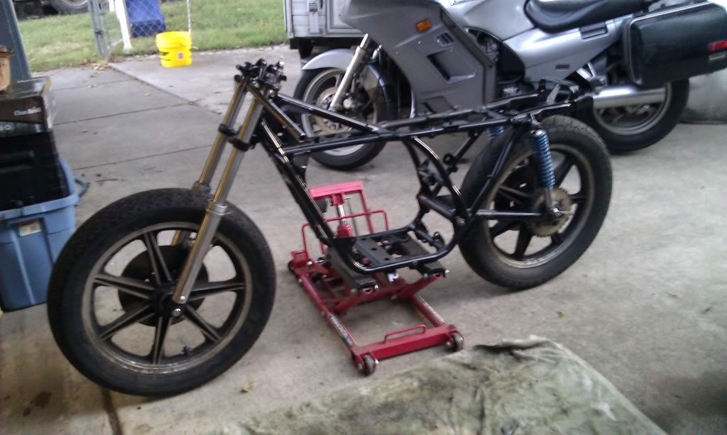 Got the bike set up as a roller for mocking up the tail section/seat pan and for steering clearances