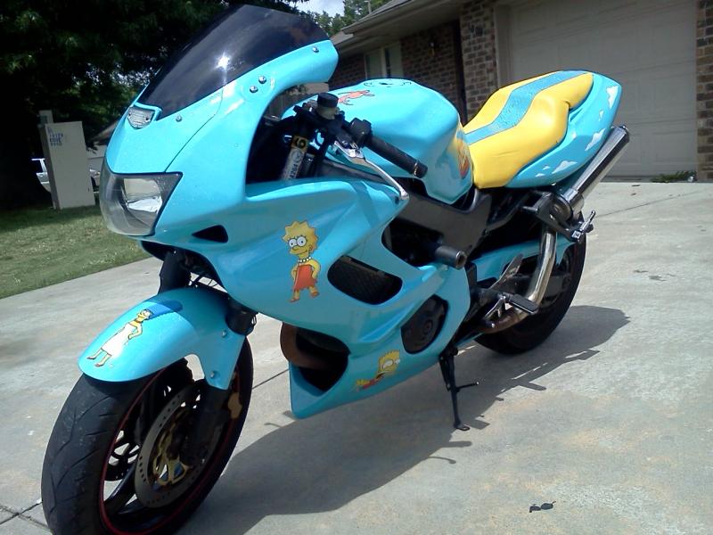 WOW COOL DECALS!!!! That truely makes it a simpsons theme bike and pulls it all together... i love the red stickers around the rims they go awesome against the blue!! What did you do with the rest of the $10000? I wish i was tough rich original and smart like you!! Keep pushing and regurgitating the same bull **** the rest of the thug culture does... I blow money I dont care I ll kill you my ***** the best meanwhile you spend money on worthless paint and a gimick not a mention of doing anything to enhance the performance of the bike your mod list has maintenance in it are you gonna list each oil change on it? Youre a fake *** wannabe thug go spit fire somewhere else youre not impressing anyone here...