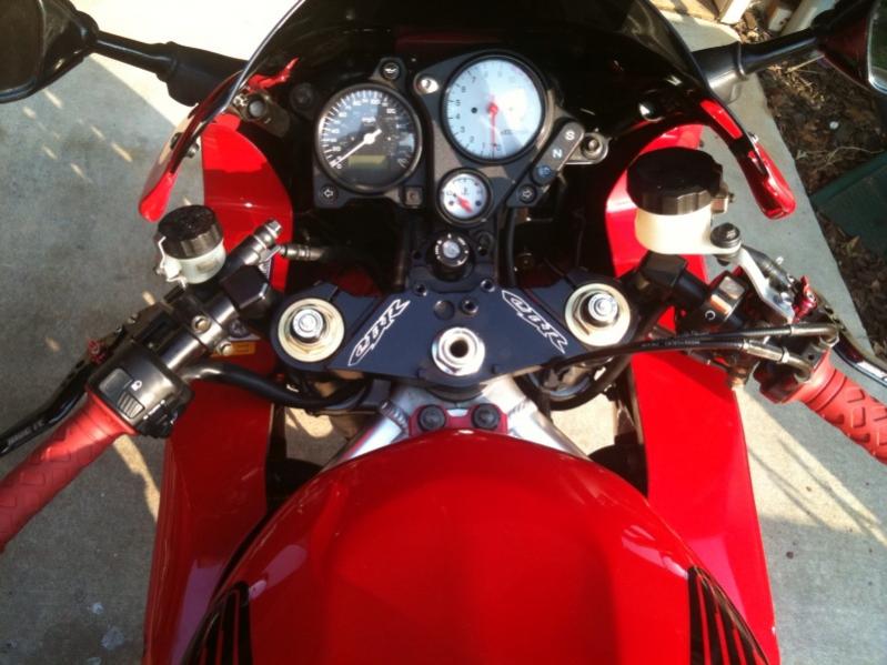 - Ontario Moto Tech triple clamps (all aluminum; 5mm less offset), had them anodized red
