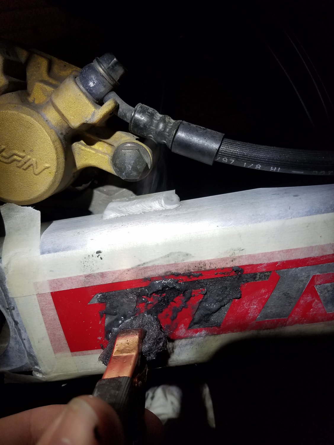 Has anyone thought of etching parts on their bike? I looked online and didn't see anything. I've done knives and such in the past. Decided to try it on the bike and it turned out OK I think. Shoot me some feedback, all it takes is a battery charger, steel wool and saltwater.