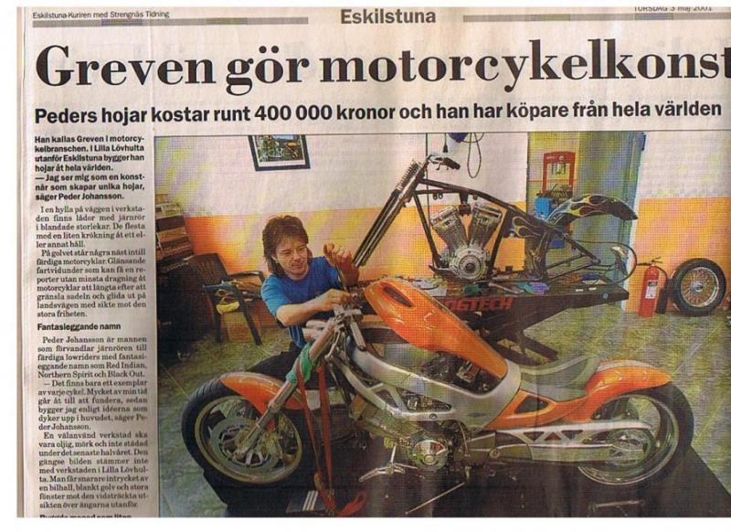Information about Kaminari Frame: Honda VTR -98, aluminum Rake: 40 degrees Stretch nope Fork: Cerani upside-down Triple trees: UCC billet aluminum, built in 5 degrees of rake Swingarm: Honda VTR -98, aluminum, extended 50 mm by new billet axle mounts Displacement: 1000 cc Exhaust system: UCC with White Bros E-Series silencer Wheels: Front: Rim: Marchesini 18”, magnesium Calipers: OMP 4-pot Rotors: ISR Tire: Avon 110/80-18” Rear: Rim: Honda VTR, aluminum Caliper: OMP 2-pot Rotor: ISR Tire: Avon 180/55-17” Driveline: S&S 113" SA, Red shift 655, Mikuni 46 mm, cam cover by Per Larsson, Pro flow oil pump Jims 5 speed tranny, BDL 3 KIT, Spyke starter 2.0 Accessories: Gastank: UCC, aluminum Oiltank: Fabricated by Hogtech, aluminium Airbox: UCC, aluminum Bodywork: Carbon reinforced kevlar by Säve Industrimodeller Support frame: UCC, cromemoly Seat: Cast foam by Hogtech, upholstered by Tina Sahrin-Kaufmann Foot controls: CNC´d by Torbjörn Hjorter Footpegs: Turned by Anton, milled by Ola Stenegärd Foot control brackets: Hogtech Handlebar: Hogtech Speedometer panel: CNC´d by Torbjörn Hjorter Headlight: Raydon Rearlight/indicators: LED´s by Patrik Westman Front indicators /handlebars: Raydon Rear axle mounts/lights: CNC´d by Torbjörn Hjorter Fenders: Hogtech, aluminum Rear caliper/plate bracket: Hogtech Rear shock: Öhlins Racing Design: Lars Jansson, Öhlins Rear suspension linkage: Hogtech Radiator: JR Bilkylare, brass Fan: Suzuki TL 1000 SPECIALS: Clay modeling: Tony Gray and Jan Gustafsson Negative plaster molds: Håkan Särnå Composite work: Säve Industrimodeller; Lars Kronborg CNC milling: Torbjörn Hjorter Electrical system: Tom Segend, Spånis, Sigge Ehrling and Hogtech PAINT: Painter: Ronny Sahlén, owner of Eskilstuna Lackforum, and Hogtech Materials: PPG Colors: Lapponia Sunset Orange, Great Lake Silver and Deerhorn Grey Graphics: Cromatechs by Wassfelts Grafiska Aluminum polishing: Bålsta Metallsliperi and BG Metallsliperi