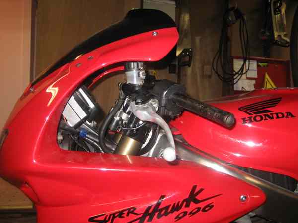 At this point I will get it ride-able as is, and deal with reduce right hand steering lock. Then I could test moving the forks up. I can feel how the ergonomics are and if I would prefer higher bars. I am already concerned that they are getting too high and too wide for trackday use, and would not want to go any higher and wider than necessary. I would rather sacrifice the looks for performance. So if I have to cut the fairing to fit the ideal clip-on, that just may be what I do.