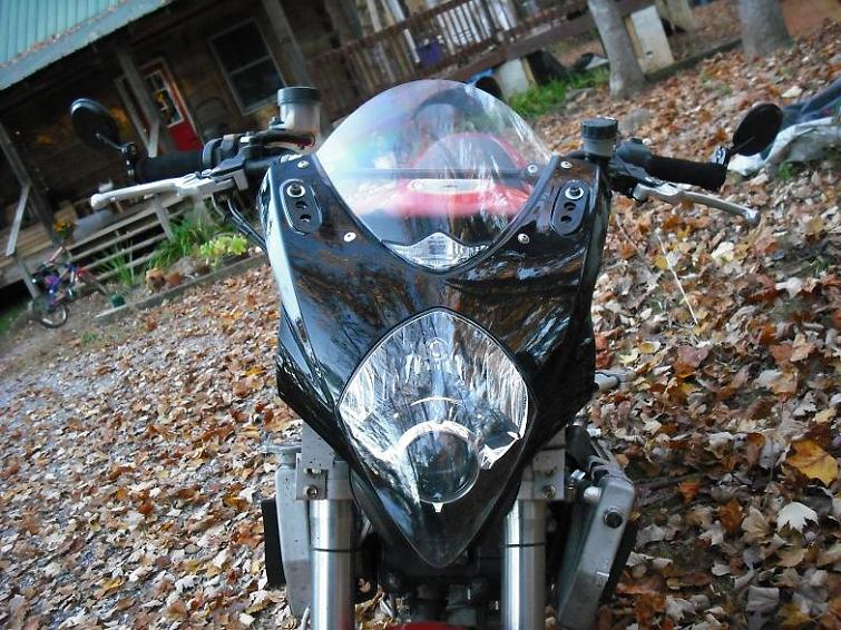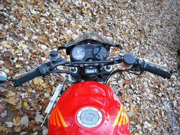 This one started as a retired racebike. Most things are still safety wired. It came with sharkskin RC51 bodywork, CBR929 front end, Fox shock, re-enforced frame, Coerce rear sets, Yoshi carbon cans with headers, Moriwaki cams (grind unknown) with Dynojet tuning. I pulled the body work, added a 07 GSXR1000 headlight, Freestyle Ingenuity bar risers, Yamaha Banshee handlebars (by Moose), mocked up a dash to hold the SPA tach and Summit speedo and CRG bar end mirrors. I've originally tried the GSXR1000 mirrors, but they were too low for any use and I didn't like the look. So I added the bar end mirrors and trimmed the fairing by 3". I like the look much better now. I have most of the parts to move the radiator to the rear, under the seat. Sometime this winter, I'll pull the motor and get it painted, silver and gold are my current ideas. Then paint the frame gloss black and the fairings and wheels flat black. The dash is just temporary, so there's machine shop work in my future. Anybody in western NC have a milling machine?