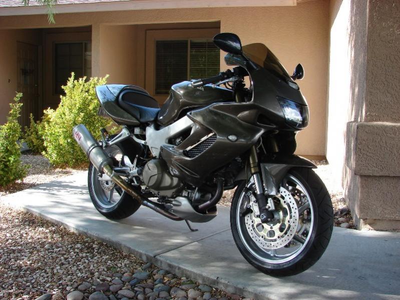 Just finished the RC51 setup on my VTR. My goal was to make it look like it came that way from the factory, hopefully I've succeeded. Before mounting the legs I had to grind down the backside of the steering stops on the lower clamp to keep them from hitting the stay mount, then I added some allen bolts to the front-side of the stops to reduce full lock. Everything else was pretty much bolt on. I reused the All ***** steering head bearings, but ordered a new lower bearing and seal for the 954 clamp. There is a little more interference with the upper radiator hose than the stock setup, but I didn't move the radiators back at all. I'd like to take the radiators down to my favorite fabricator and see if he can angle the upper outlets inward. Overall turning radius will also be decreased, but hey, it sucks on the RC51 too.