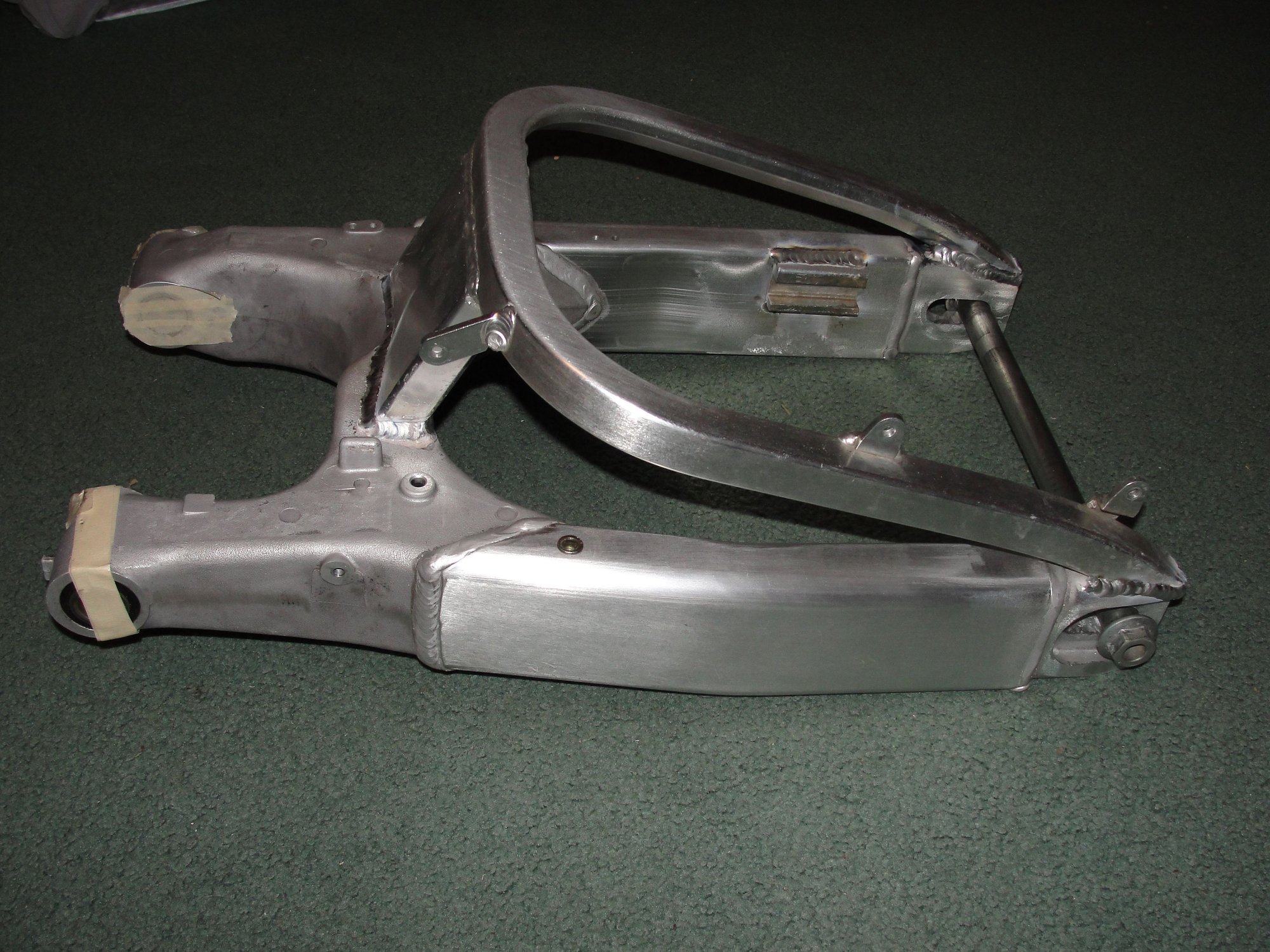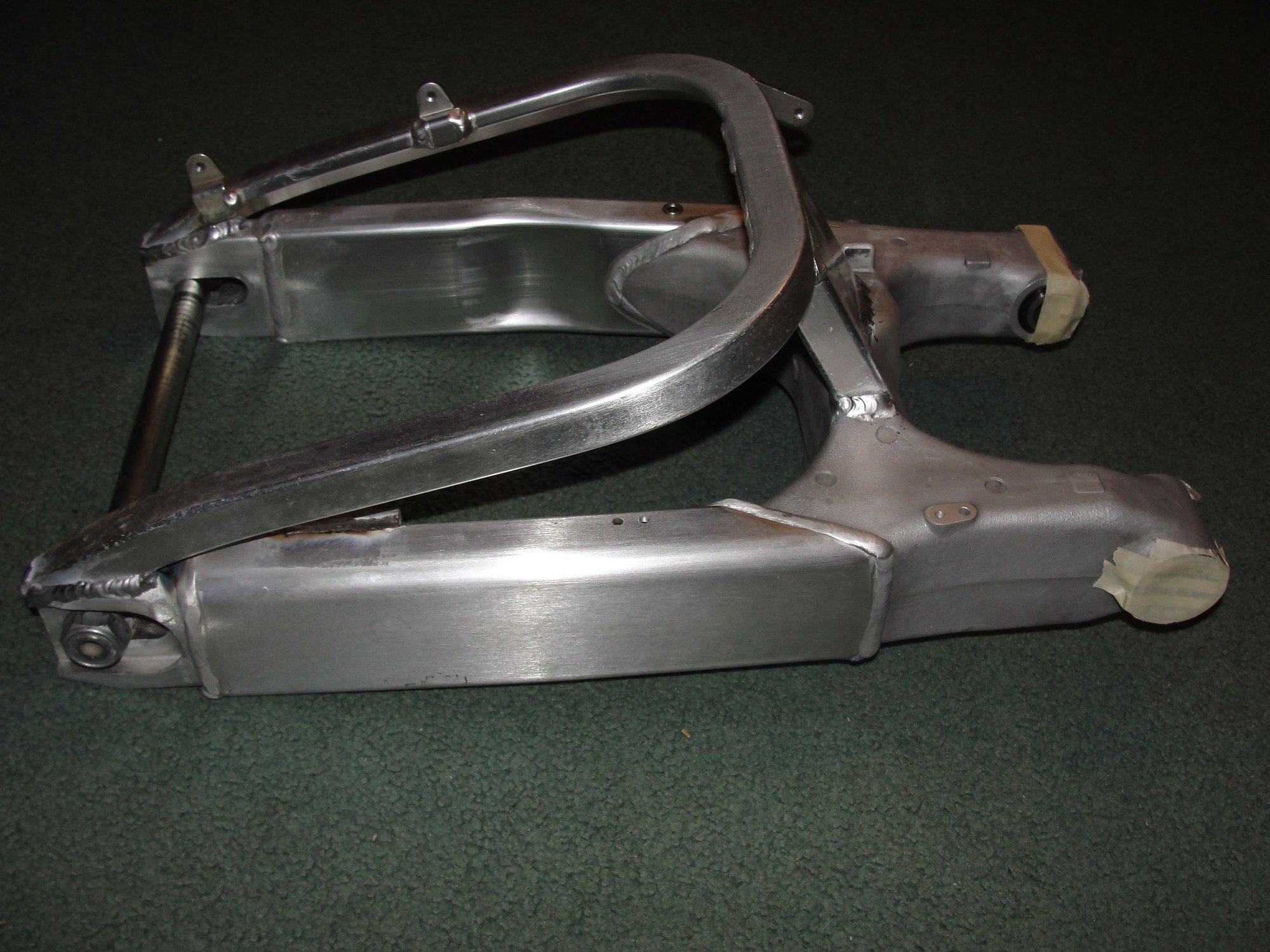 In a fit of old man boredom, I decided to build one of them there braced swingarms. Not because I ride hard enough anymore, but more for the aesthetics and boredom. I researched what I needed and got a '93 CBR900RR arm for the rectangular center brace and a '98 CBR900RR for the actual brace because of the tapered ends seem to fit better at the axle end. I also got a '98 brake bracket. I got all the parts and cut and trimmed until everything, braces, brake stay, Etc. fit up nicely. I then de-anodized all the parts in preparation for welding. Then a thought came to my senile brain. I don't know how to weld aluminum! So I bought a TIG and started practicing on the remnants of the leftover swingarm pieces and a multitude of scraps. After hours and hours I finally go to where my welding was satisfactory for my purposes. After sufficiently clamping and bracing it, I attacked. It came out pretty good for a first timer. Off it went to the anodizers, I went with a low sheen clear so as to not look "new" and shiny. I discovered that the rods I used contained trace amounts of silicon which caused the welds to come out a bit dark. But, it looks fine. The next challenge was finding a carbon fiber hugger for a '98 CBR. I found the pieces I needed Europe from two different sources. It all came together yesterday. I don't know if I can feel the difference, but I like how it fitted up. This COVID 19 is costing me dearly.
