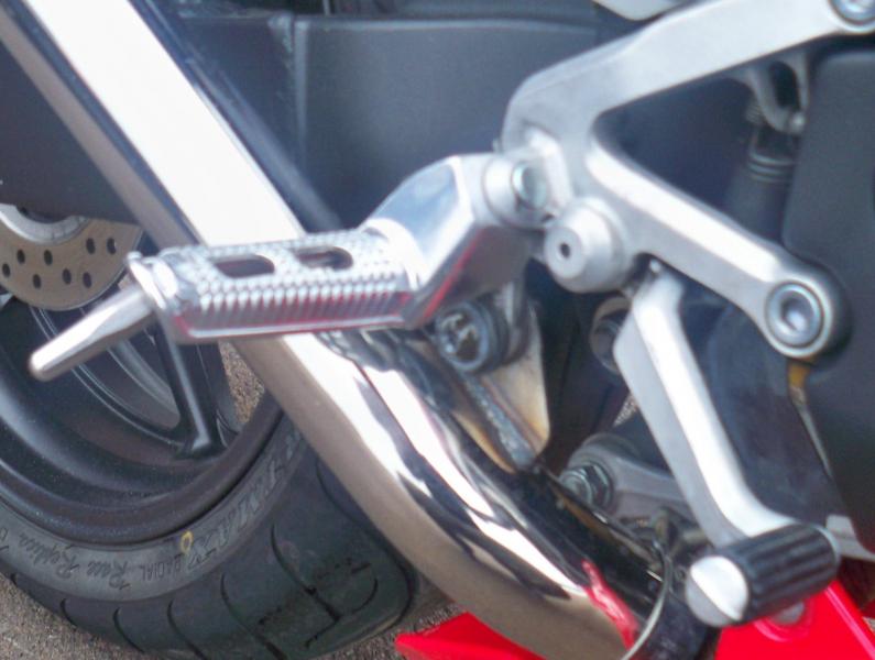 Whereas the Buell swap is much cheaper and bring the pegs down about an inch, they also put them back about 3/4" rather than straight down. I eventually wanted them more straight down, so I went with the 8 position adjustable MFW Vario 2-pc adapter/arms and "racing" pegs which cost about $90 total. I got the 1.18" (30mm) lower adapter brackets (arms) but they make 25MM & 50mm brackets too; I thought 50mm ( about 2") was too much. I posted a thread about this before with pics.