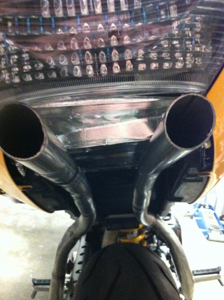 Ok so I finished the exhaust.. Im not going to lie its not really an exhaust.. More as an "test pipe" exhaust. I ran both exhaust tubes up under the tail and out under the tail light. Looks really good and sounds like a something from hell.. I haven't had the privilege of pissing off the neighbors yet but so far it is exactly what I wanted to start with.. Im going to leave it as is for right now and finish up the rest of the fabrication for the heat shielding and undertail.. But i am very pleased with the results. Ill take some pictures as soon as possible and get them on here.