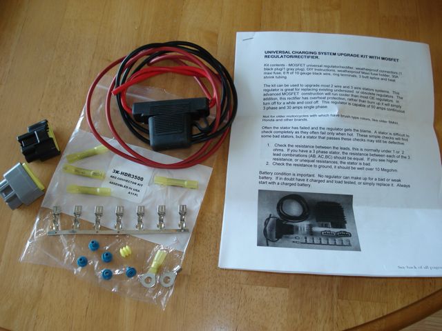 I contacted Jason about an install kit without an R/R because I already had an R/R from a 2009 Kawasaki Concours CG 1400. Jason sent me a kit faster that the speed of light and the kit was perfect for what I needed. If I had found Jason sooner, I would have purchased his complete Universal Mosfet upgrade kit. Someone else found it and posted it here - that's how I found Jason. Anyway here is a pic of the kit I got. It was $30 + $5 shipping and handling. The whole kit, including a new Shindengen Mosfet R/R is $120 on e-bay. I've got to believe that just the weather-proof 30 amp in-line fuse that Jason shipped would run $20 at Radio Shack. The included instructions are outstanding. Very easy to follow, including photos, wiring diagrams and testing information.