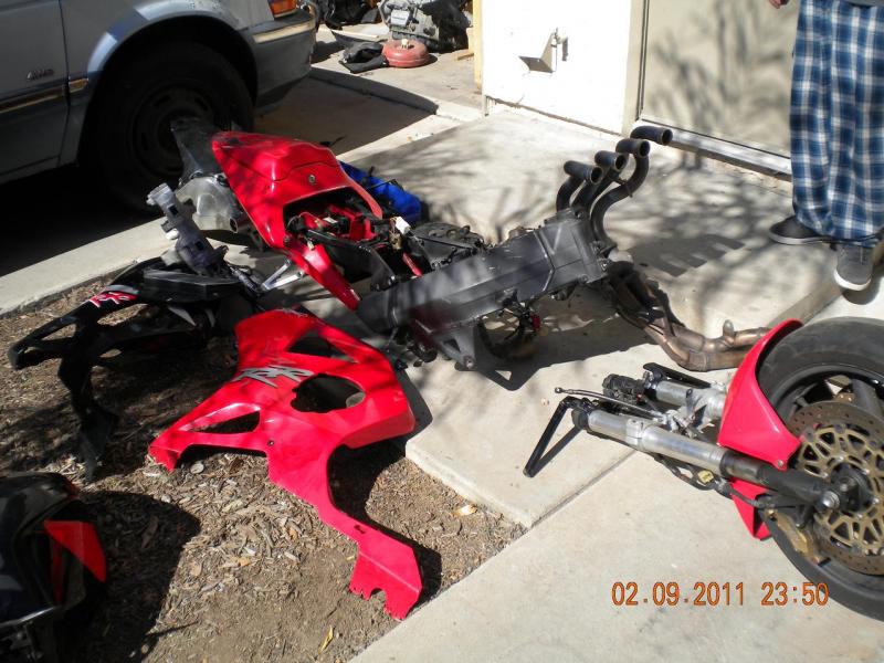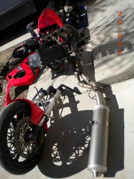 ) an eye and so why not take a short road trip and rent a truck and come up on some way cool extra parts which of course taking them apart is GREAT for my education! So all the more power to me, right? Nothing fishy, got the title, vin, lisc plate number all that. His buddy owed him money and paid him with a bike in pieces, he could care less about bikes ad bam! Blink just bought most of a 954RR for $600 + truck rental (232) + gas (150is) = About a G and I figure the plastic and the engine together should cover that, no? Come on guys, tell me I did good, I'm a bit nervous about it all...