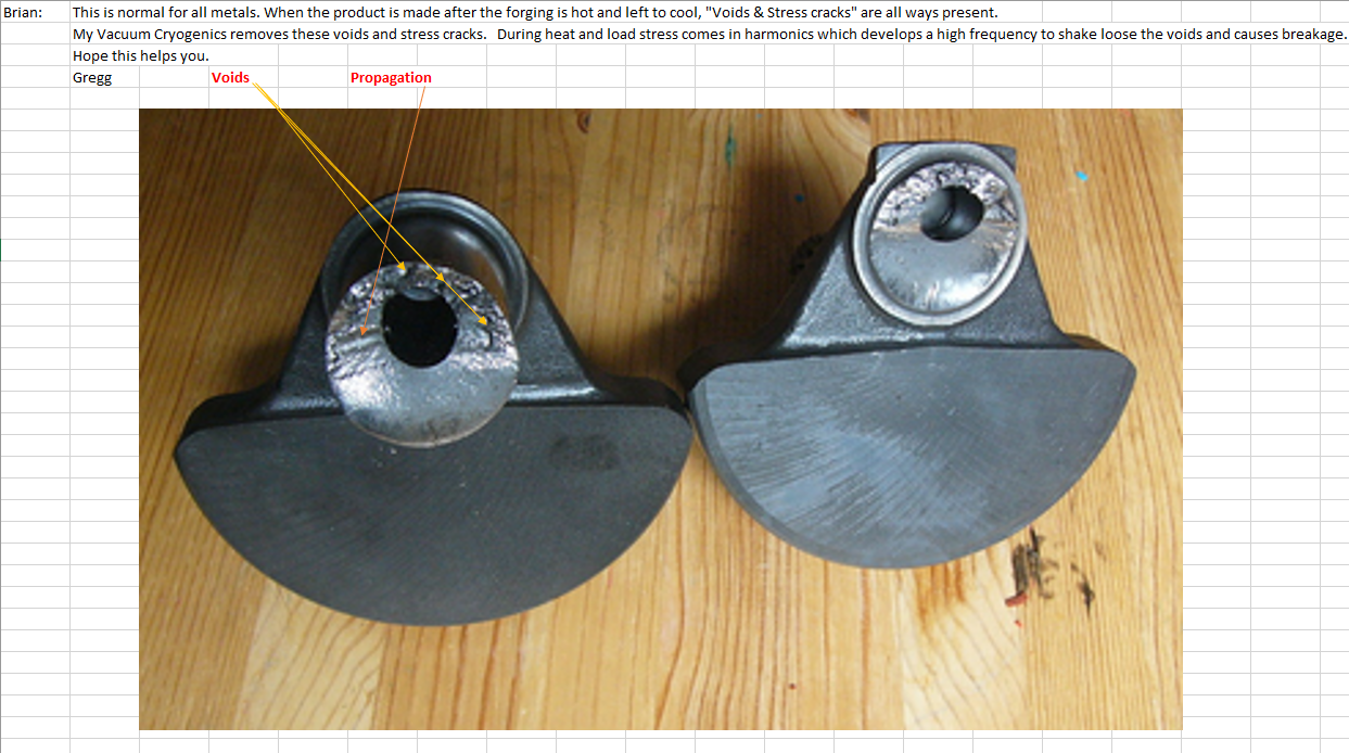 .Also...... "My Vacuum Cryogenics REMOVES THESE VOIDS AND STRESS CRACKS..." ????? No.... It doesn't.... May cause them to be less of an issue by hardening the metal around them, But no amount of any kind of tempering will fix a crack, or fill a void...
