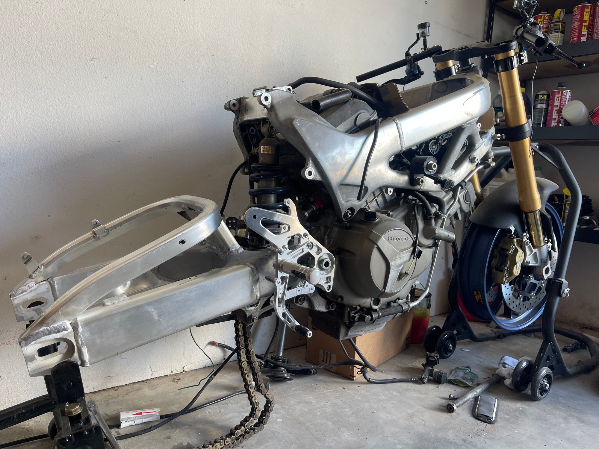 Finally got the swing arm brace welded up by guys on base and mounted the Moriwaki rear sets. Need to look for a light weight rear wheel if I can’t get the Aprilia rear to fit to match the front end.