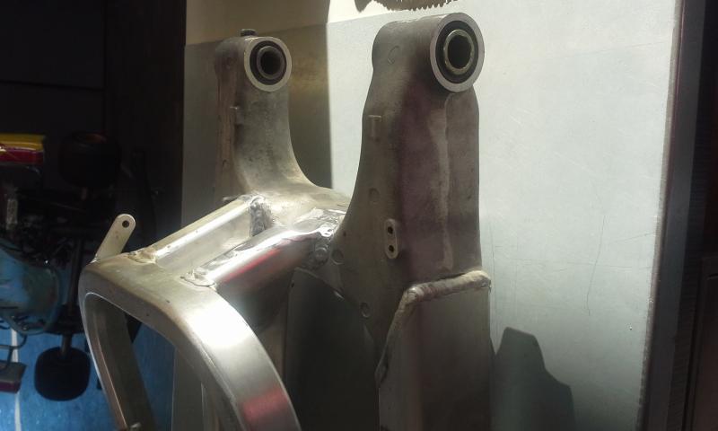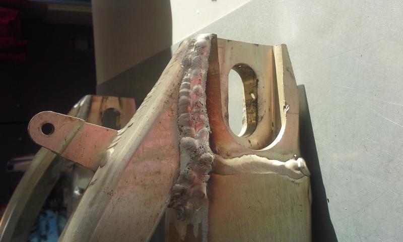 My welder and I misunderstood each other. I asked him to weld the brace flush with the rear of the swing arm. He welded it flush to the front. So, since I didn't want to start over, I just cut a little deeper the front right leg/spar in order the clear the shock relief. Once this completed, I had him fill the hole up, and, I buffed it out.