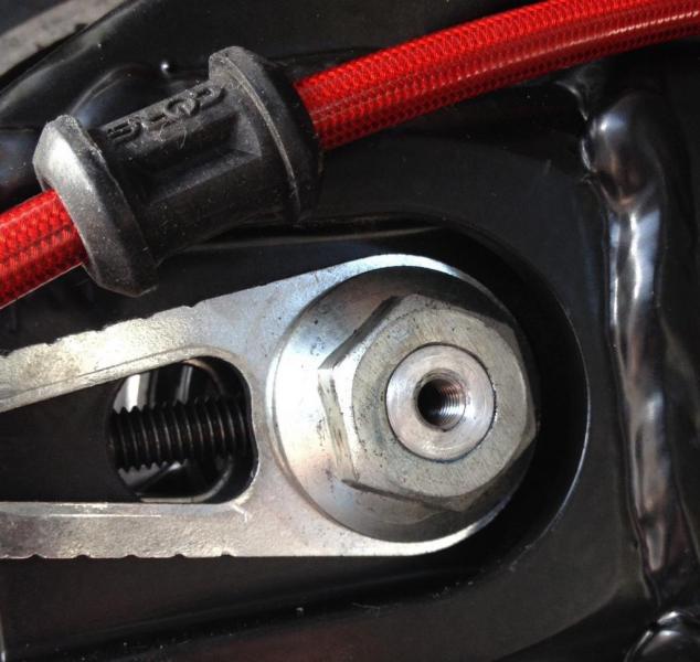 Decided on routing the line along the OEM route.. top of the swing arm, using the original forward swing arm point with a different clamp.