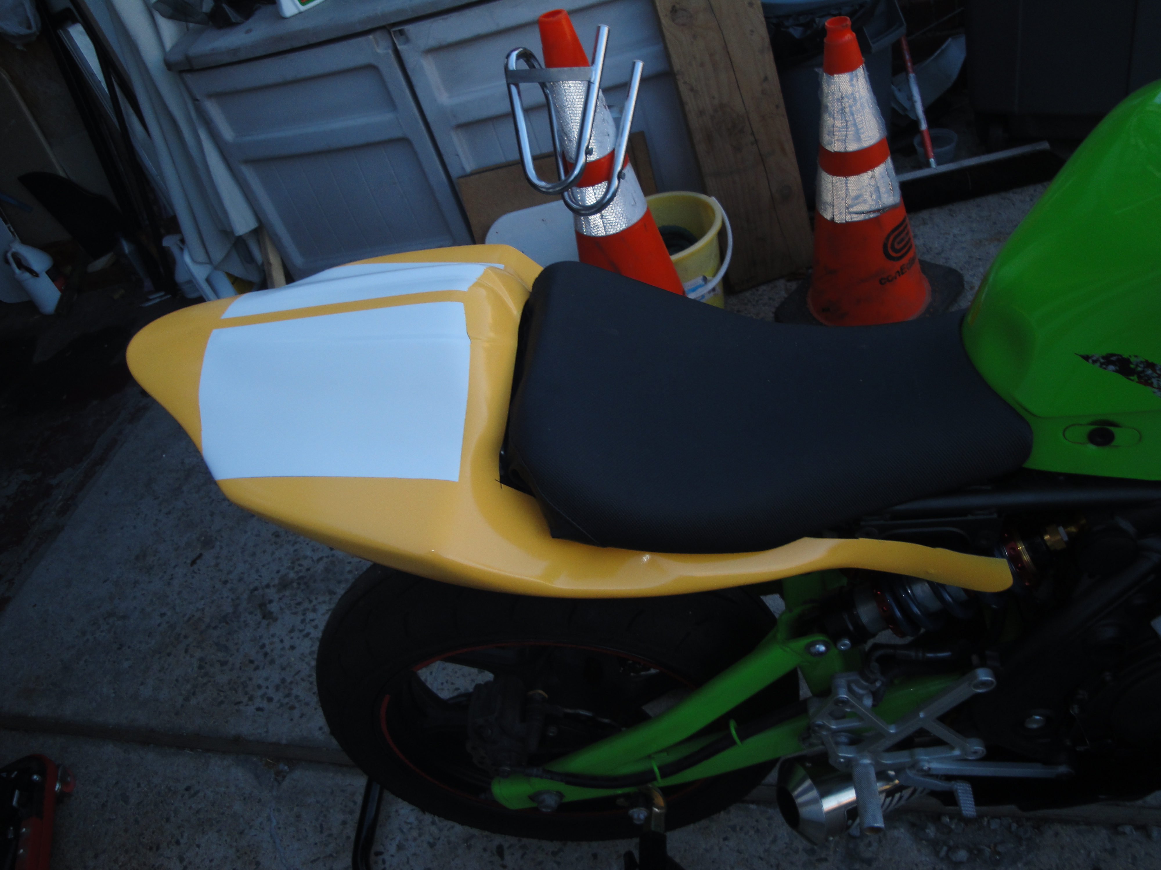 If it were mine, I would leave the tank and swingarm that color. When I first read this thread, I saw the pictures first and made me do a double take. It messes with your head, the colors and the body work. You have no idea what the heck it is at first glance. I love it! Cool bike man. Nice score on the exhaust.