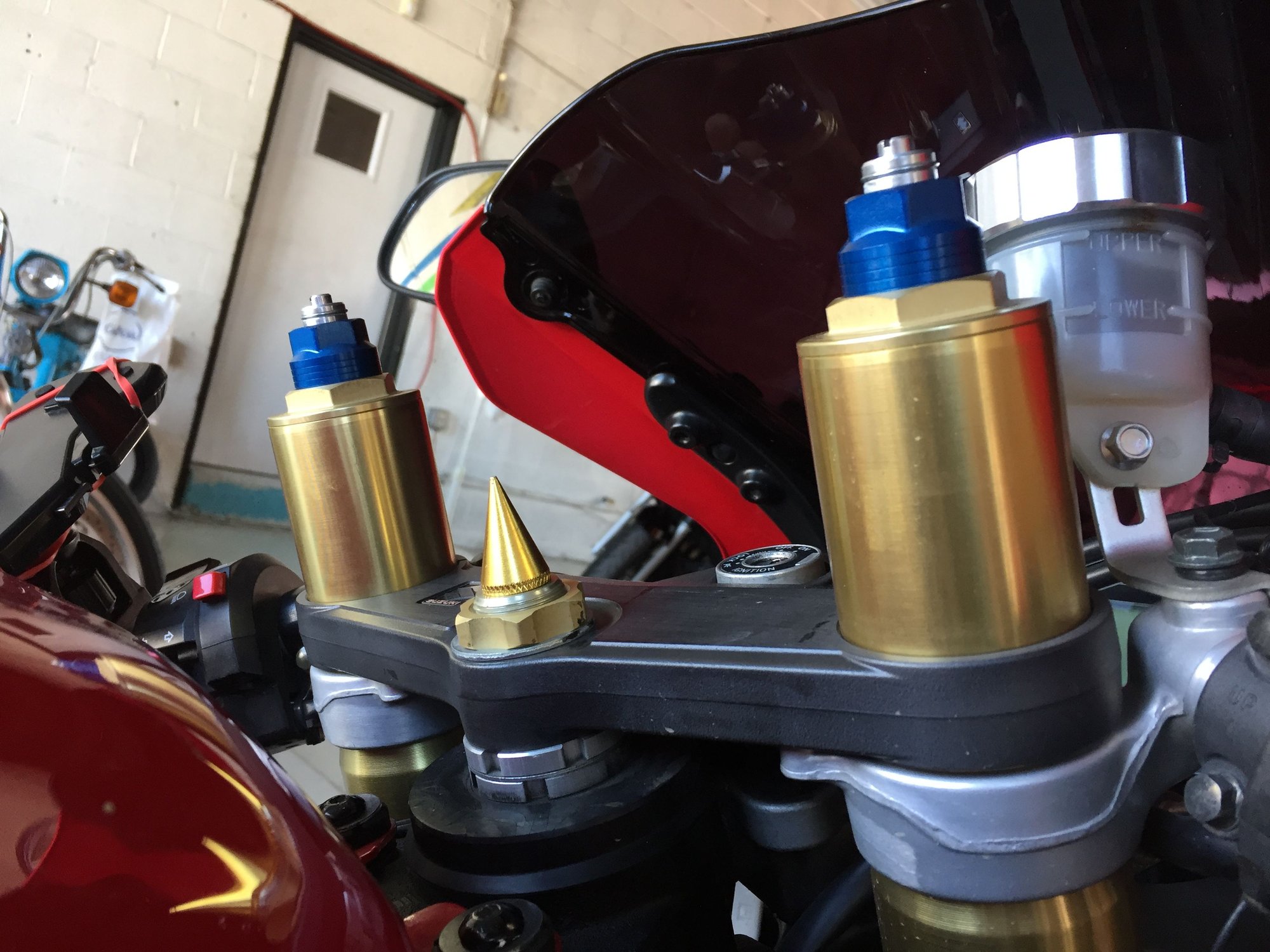Ooooh, great catch. ya, your forks are too low in the triples and should be raised up, similar to Wolverine's pic of the yellow VTR. OEM has the bar clamps mounted to the upper fork tubes, looks like your were slid down after the bar conversion... definitely will cause issues.