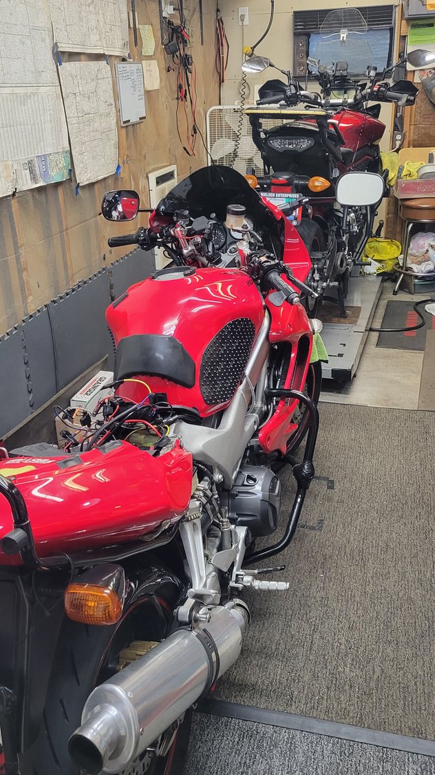 Wow nice garage and bikes. Looks like you could sleep in there with them. I was about to put similar driving lights on the vtr but they wound up on my TTR125. Real nightcutters.