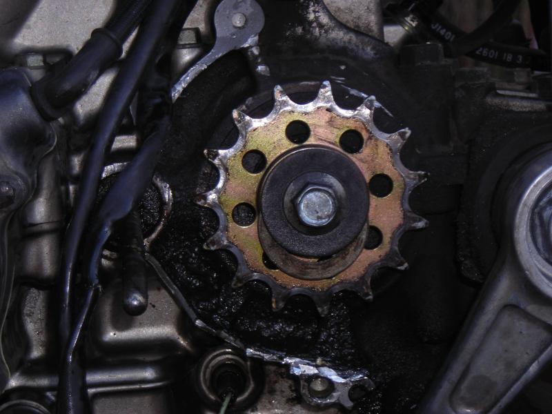 As to the brand of sprockets/chain - couldn't tell you if I had to. Bought the bike used from a friend of mine last September. He kept good records on everything with that exception. He always had a Honda shop work the chain because he didn't want to be the crimper for the master link. As to the odd look of the washer(s) around the front sprocket - you're right. I'm not sure what the hell was going on there. There are two washers there instead of one, neither of which appears to be concaved. The sprocket is also a little loose, but I'm guessing it was from the incident or I would have seen it already. Needless to say, that will all be replaced per honda spec.
