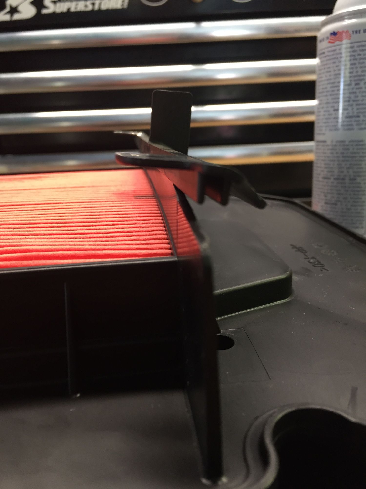 This shows the piece from the airbox lid siting on one side and the warp of the HiFlo filter. Hard to see with a picture.